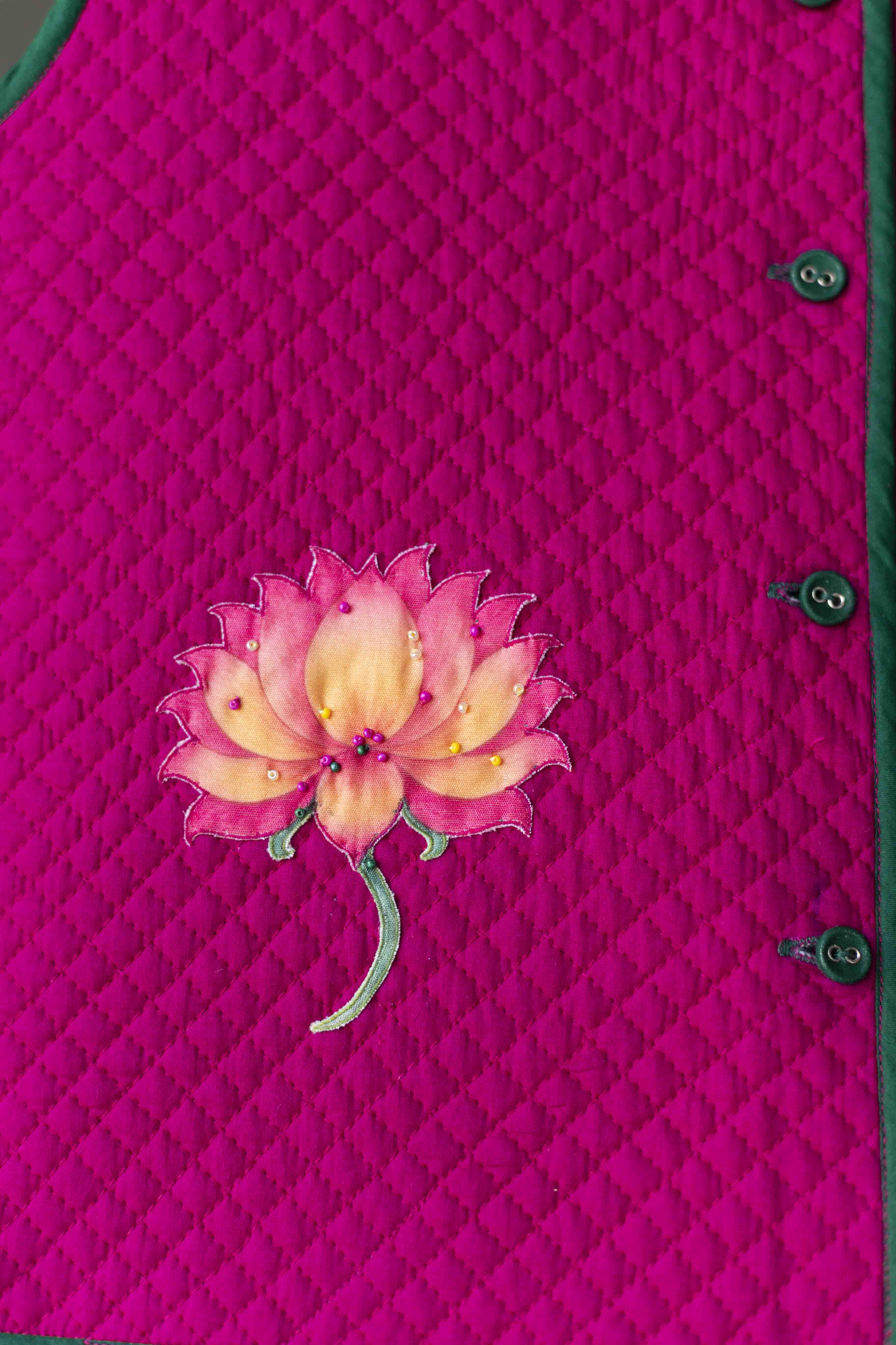 Finished with contrast green piping, this fuchsia cotton stuffed quilted bandi layers beautifully over kurtas — perfect for festive occasions, weddings, and family celebrations.