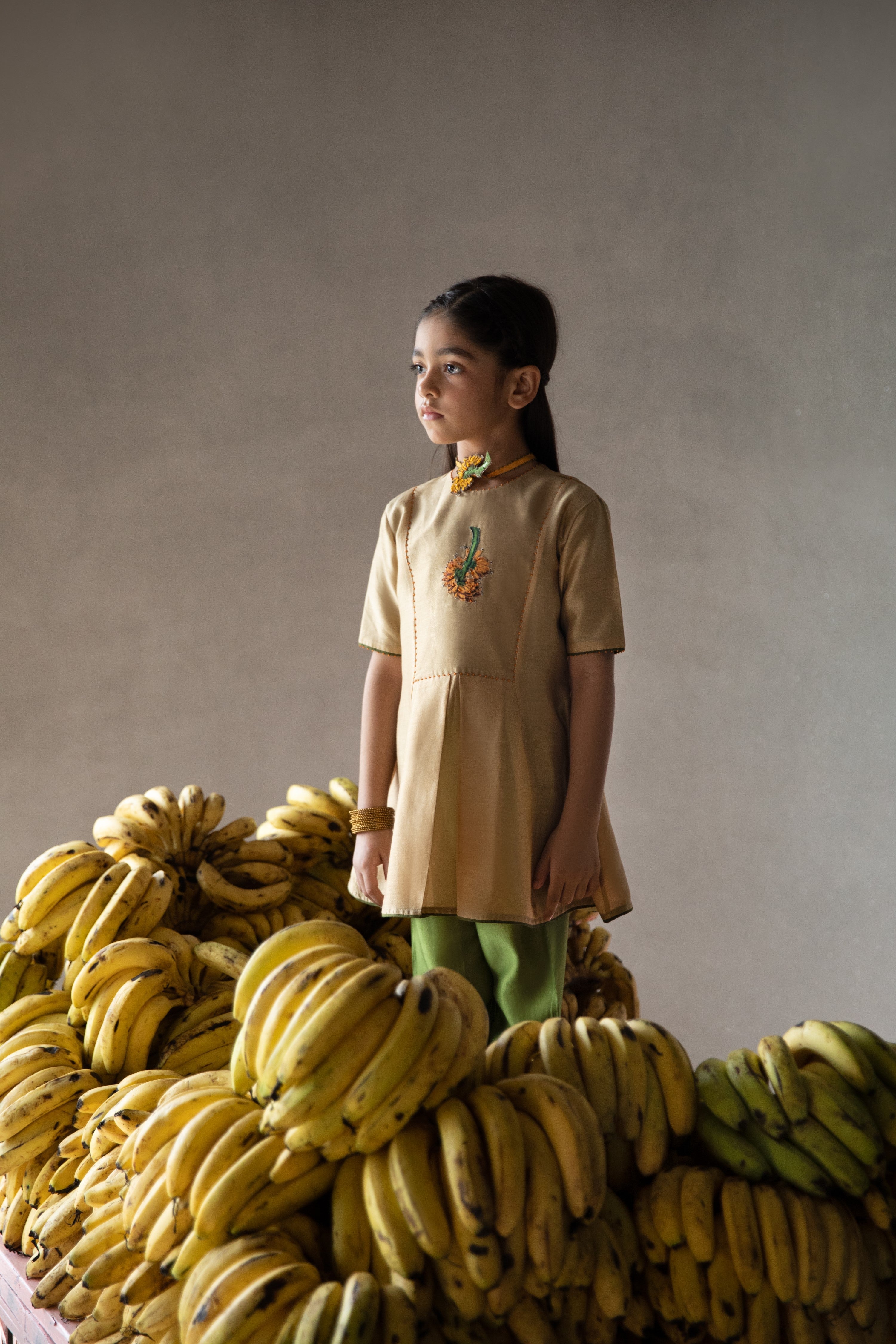 Sunehera kalidar kurta has box pleat detailing with hand-applique embroidery brooch, orange bead detailing on the round neckline and yoke and it is paired with a solid olive pyjama.