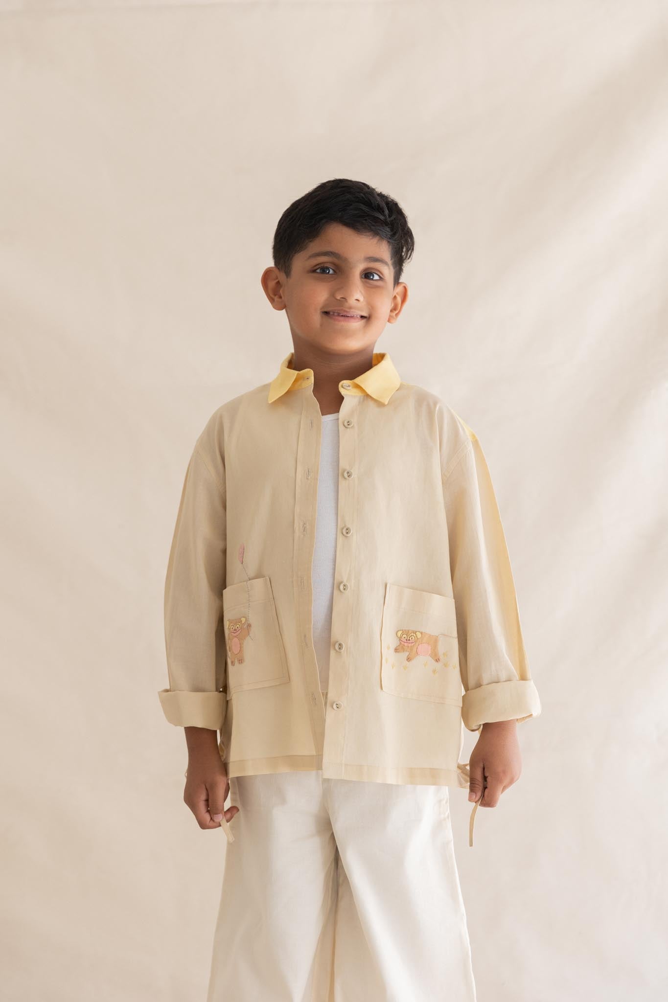 Full sleeve shacket with a contrast classic collar. Hand embroidered applique on the front patch pockets with a button- up front