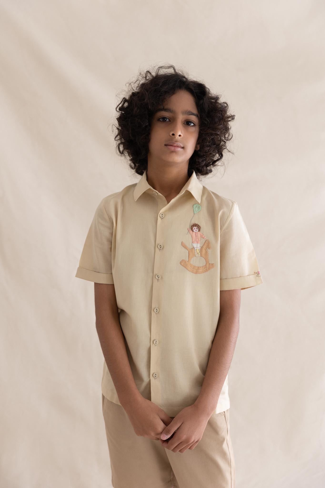 Short sleeve shirt with a classic collar. Hand embroidered applique on the front and detail on the side, with button- up front