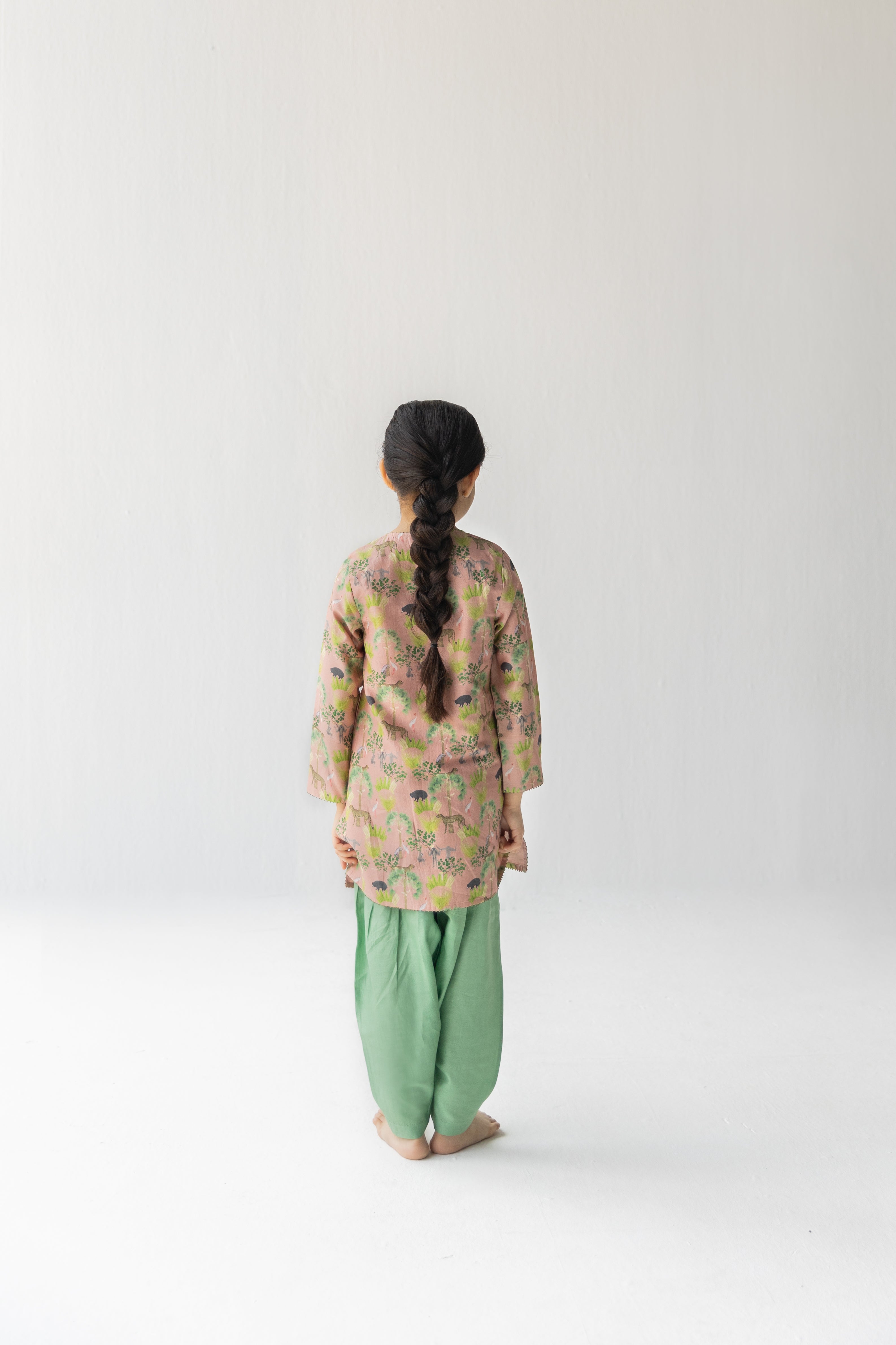Blush sunderban print full sleeves kameez with beads embroidered neckline is paired with a mint voile salwar has buttons detail at the bottom.