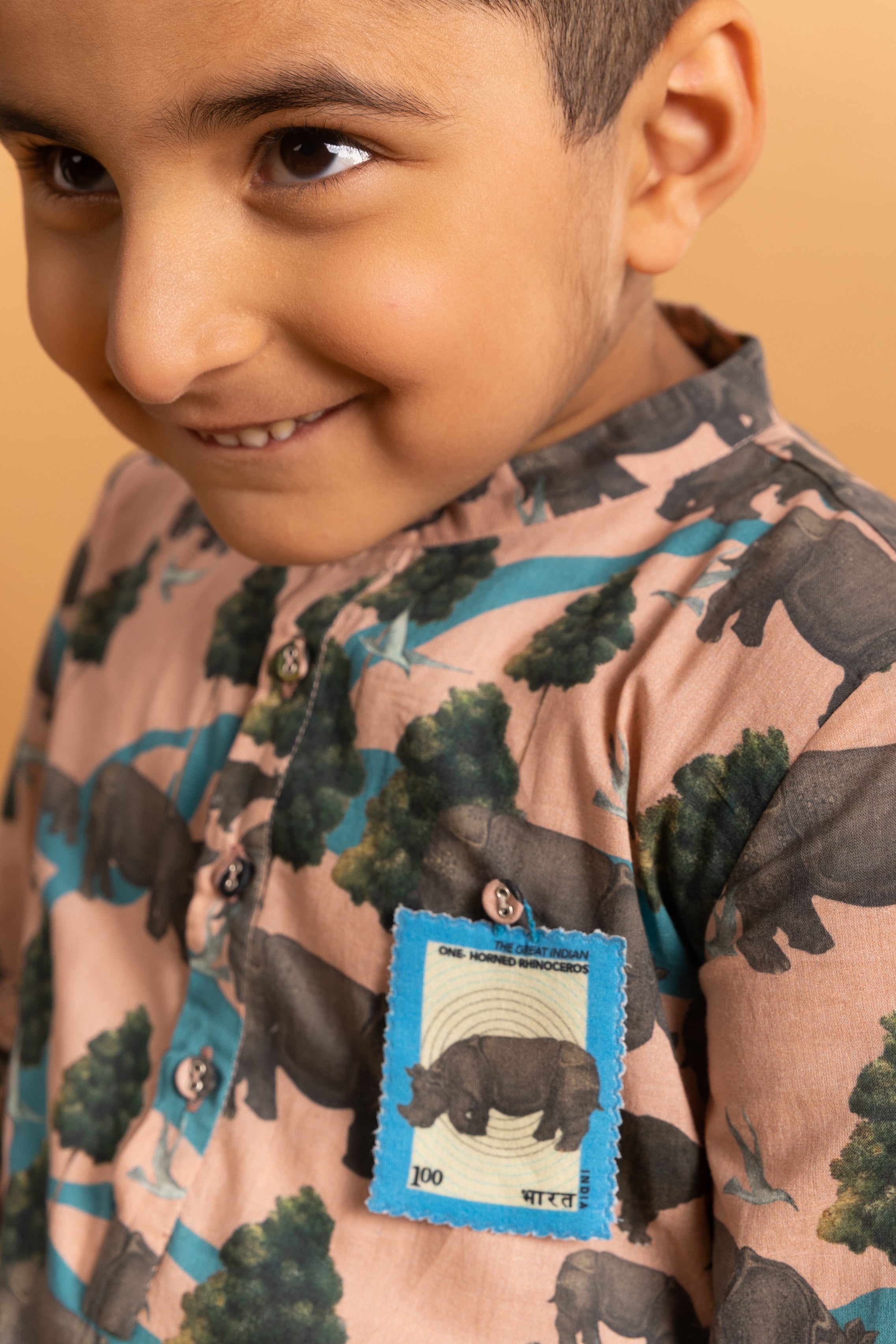 Blush Chimti Aur Genda print full sleeves kurta with mandarin collar and a postal stamp brooch placement is paired with an ivory voile pyjama with has full elasticated waist and side pockets.