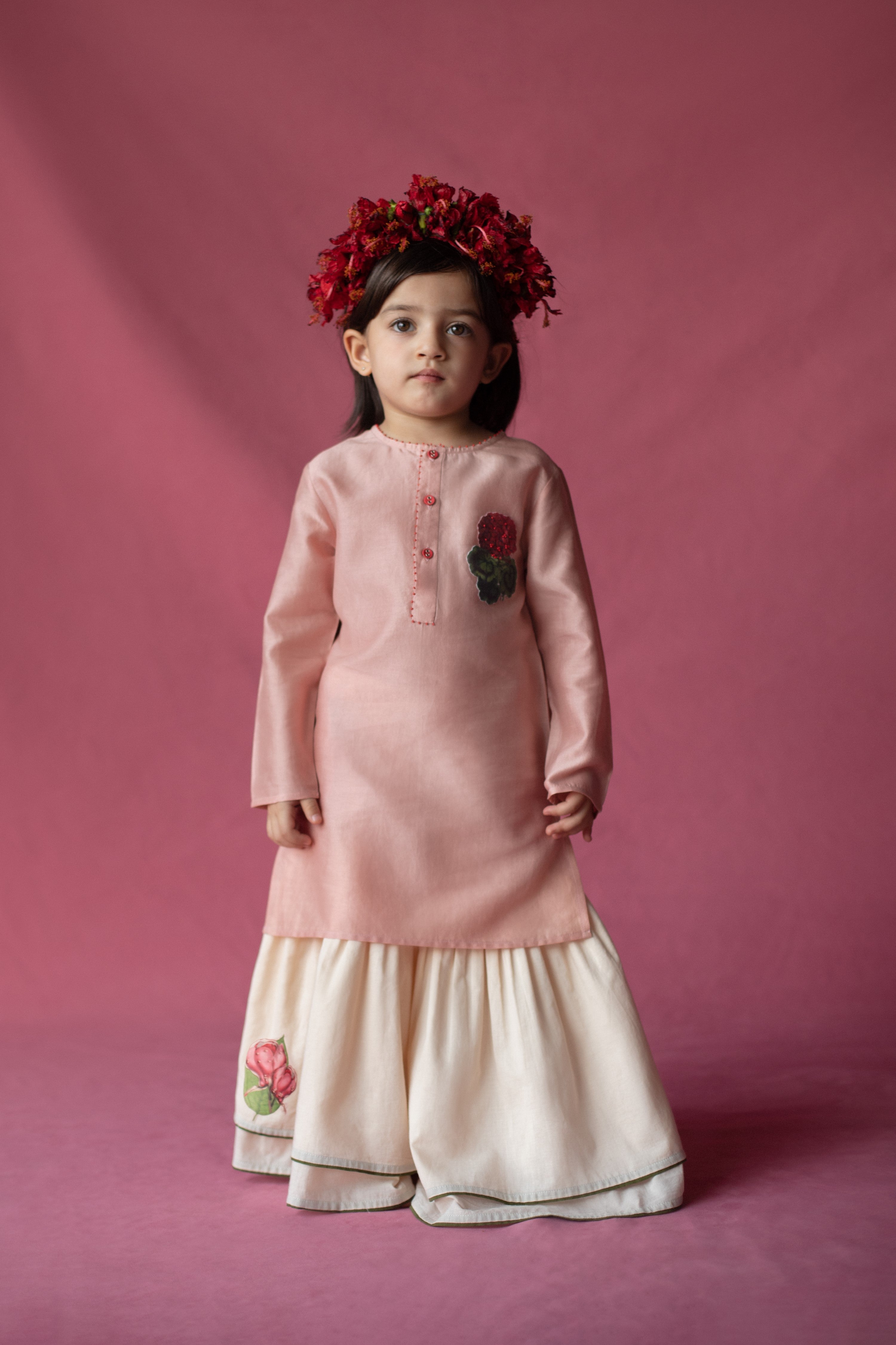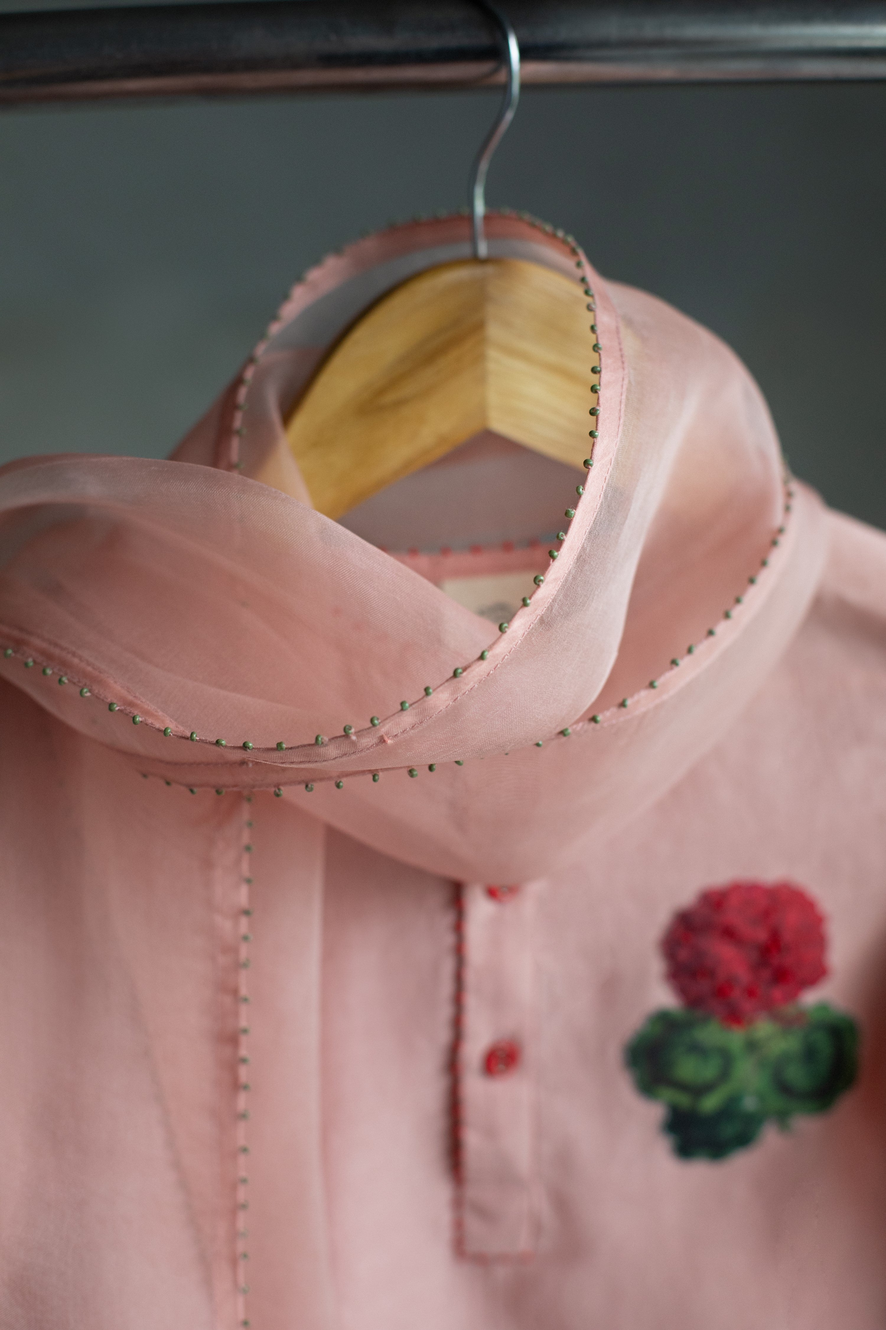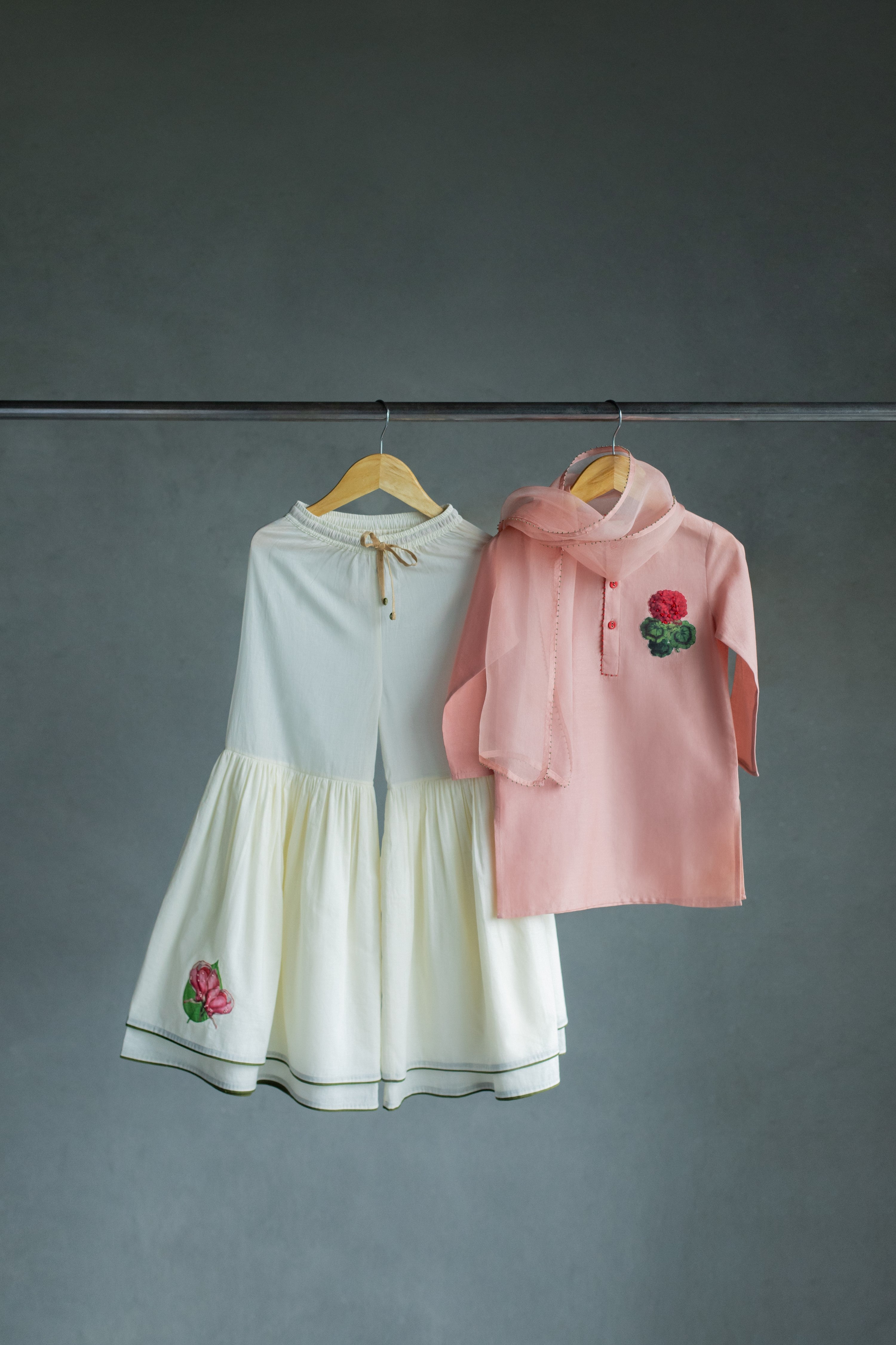 Gulab kameez has bead detailing on the round neckline with hand-applique embroidery brooch. It is paired with an ivory cotton sharara and a silk organza dupatta. The dupatta has bead work on the hem.