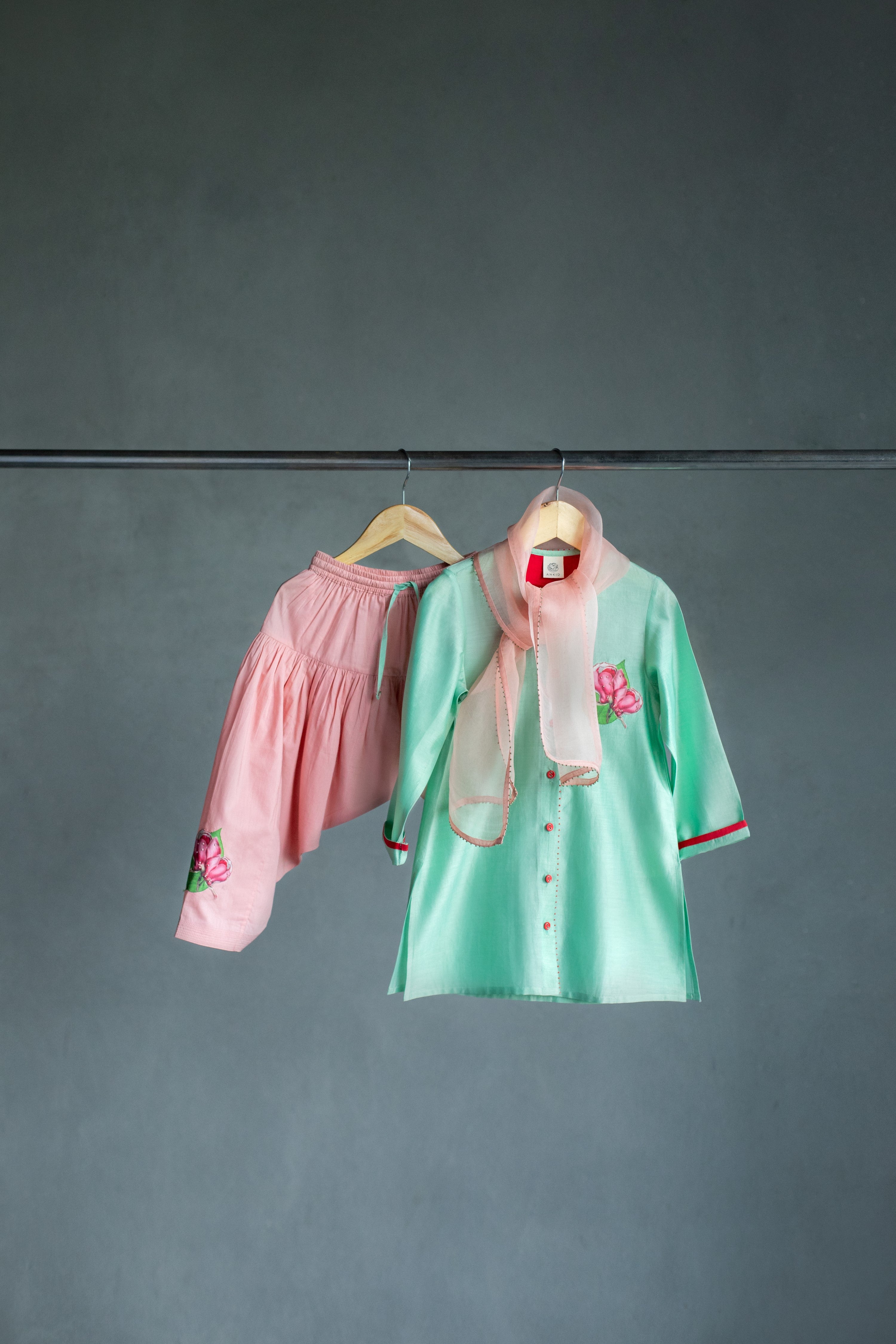 Roshan kameez has red bead detailing on the round neckline with hand- applique embroidery brooch, is paired with blush cotton salwar and a blush silk organza dupatta. The dupatta has bead work on the hem.
