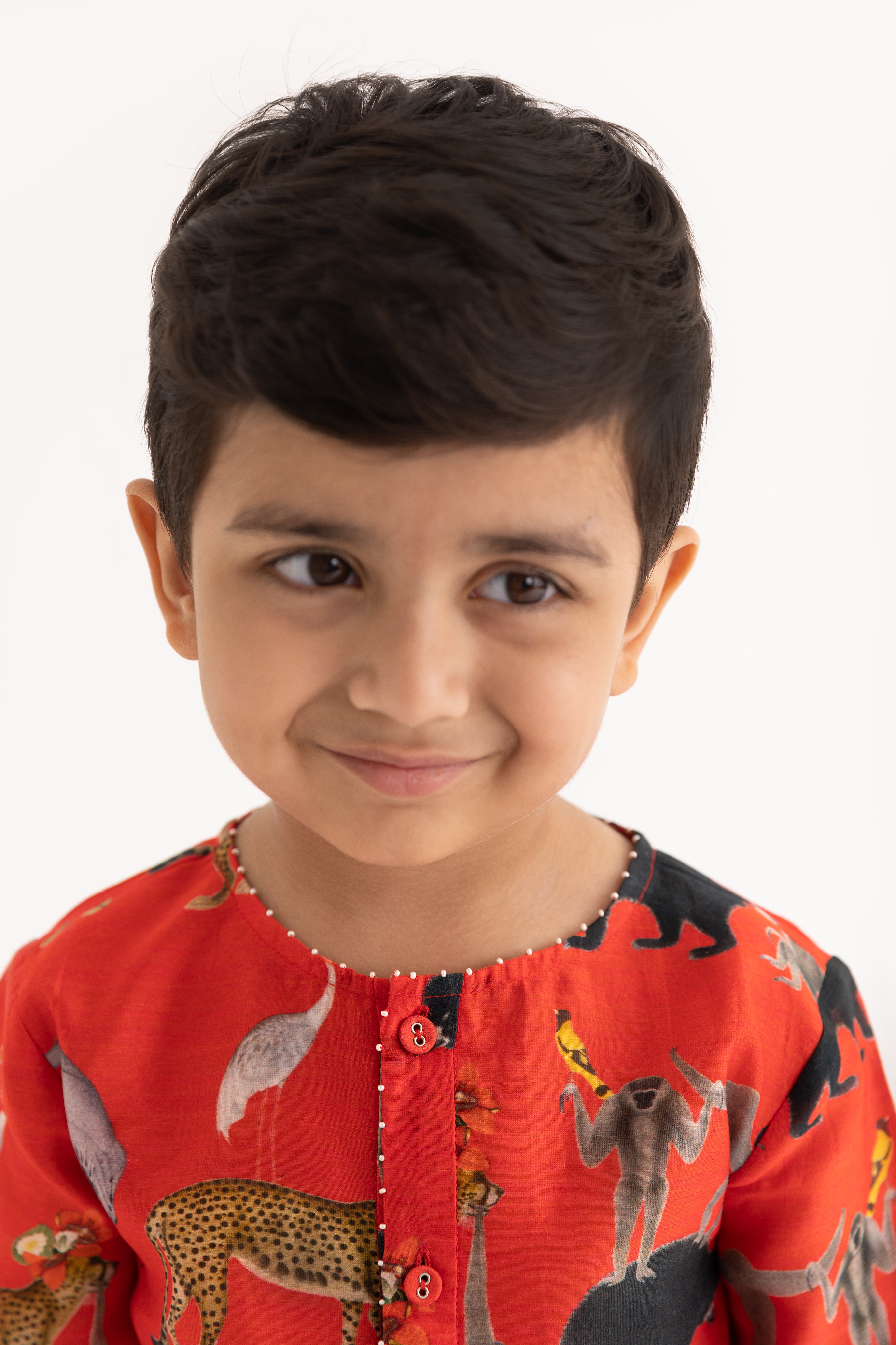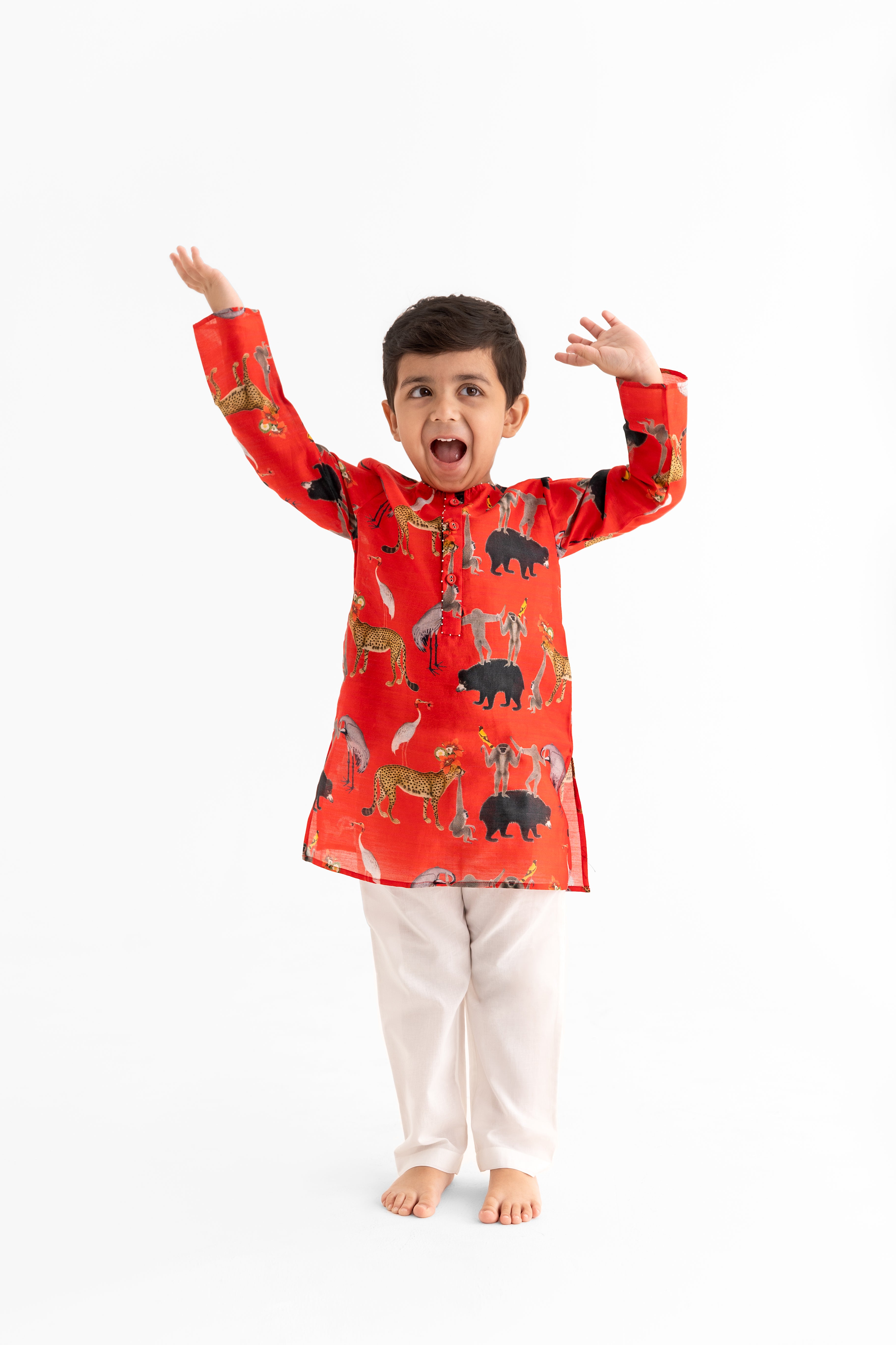 Red chidiya ghar ki sair print full sleeves kurta with ivory beads embroidered neckline is paired with an ivory voile pyjama.