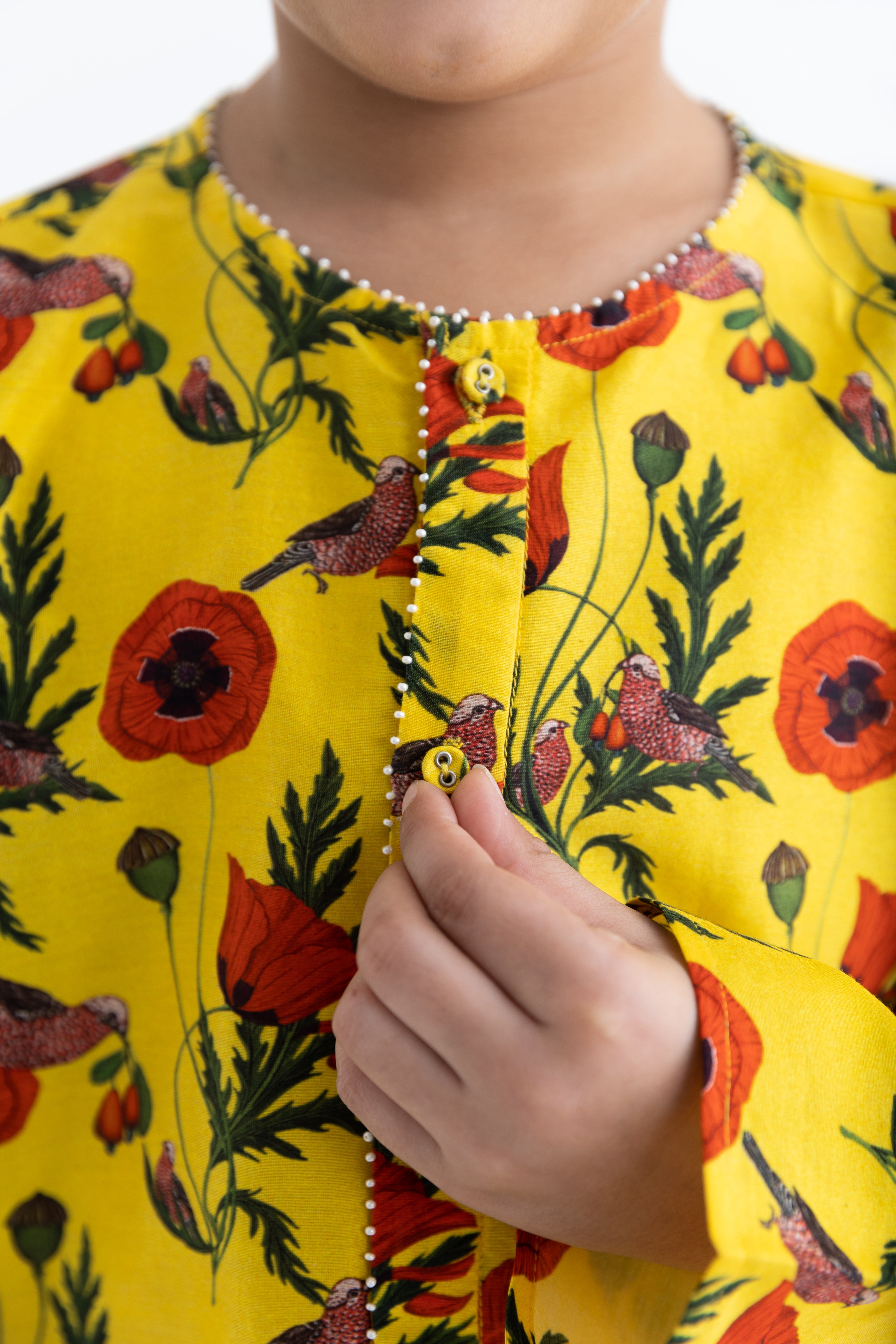 Yellow chidiya rani badi sayani print full sleeves kurta with beads embroidered neckline, is paired with an ivory voile pyjama.