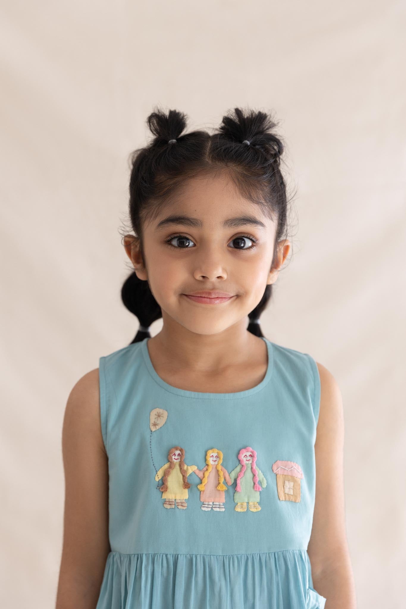 Dress with a round neck with hand embroidered applique on the front chest, contrasting bottom and sleeveless design. Featuring back button