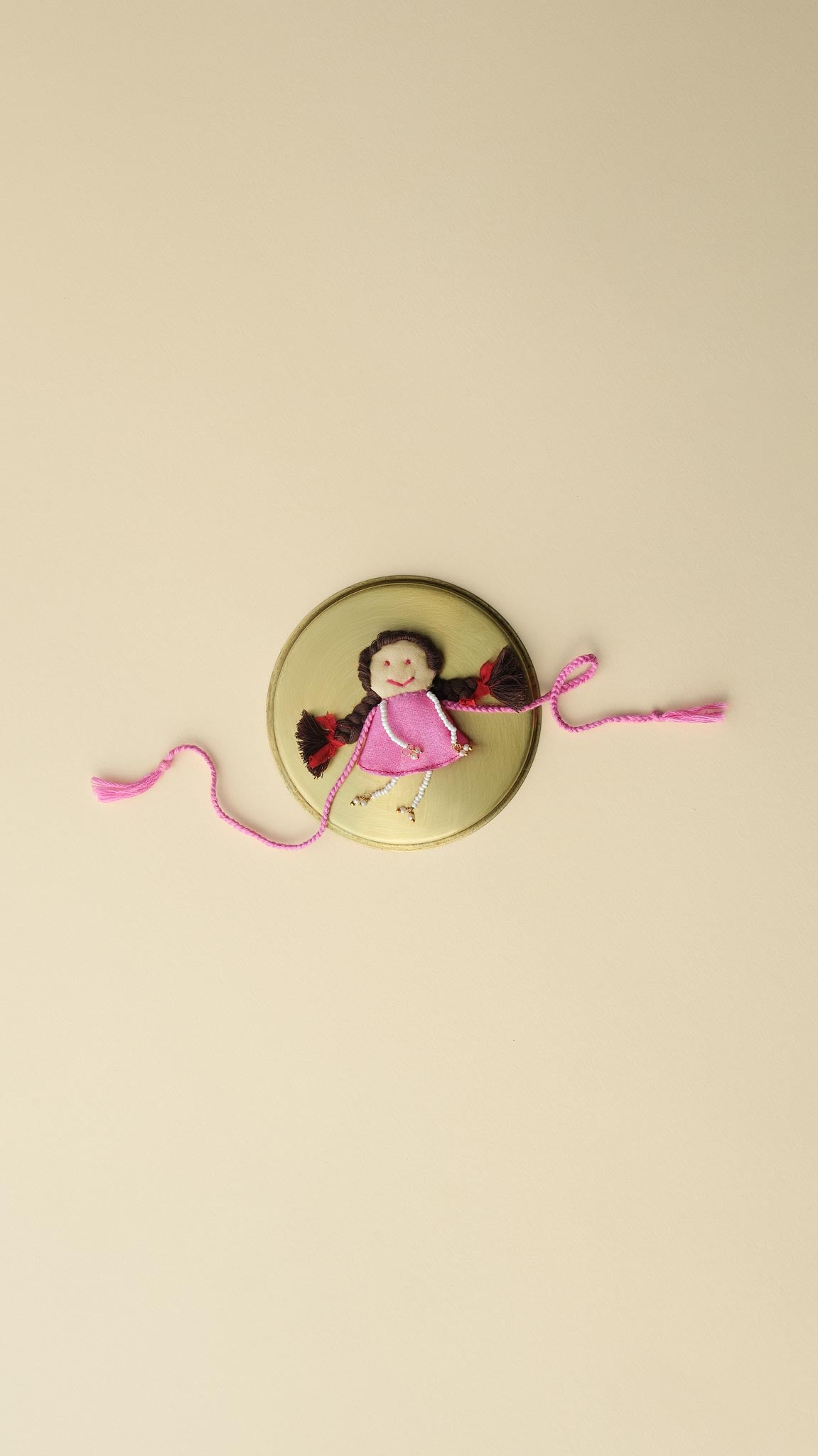 Meet Gudiya — the little girl with rosy cheeks, braided hair, and boundless joy in her step. Dressed in her bright pink frock and pom-pom braids. This handcrafted Rakhi is made with soft fabric and delicate threadwork, designed to celebrate the bond of childhood in its most innocent form.