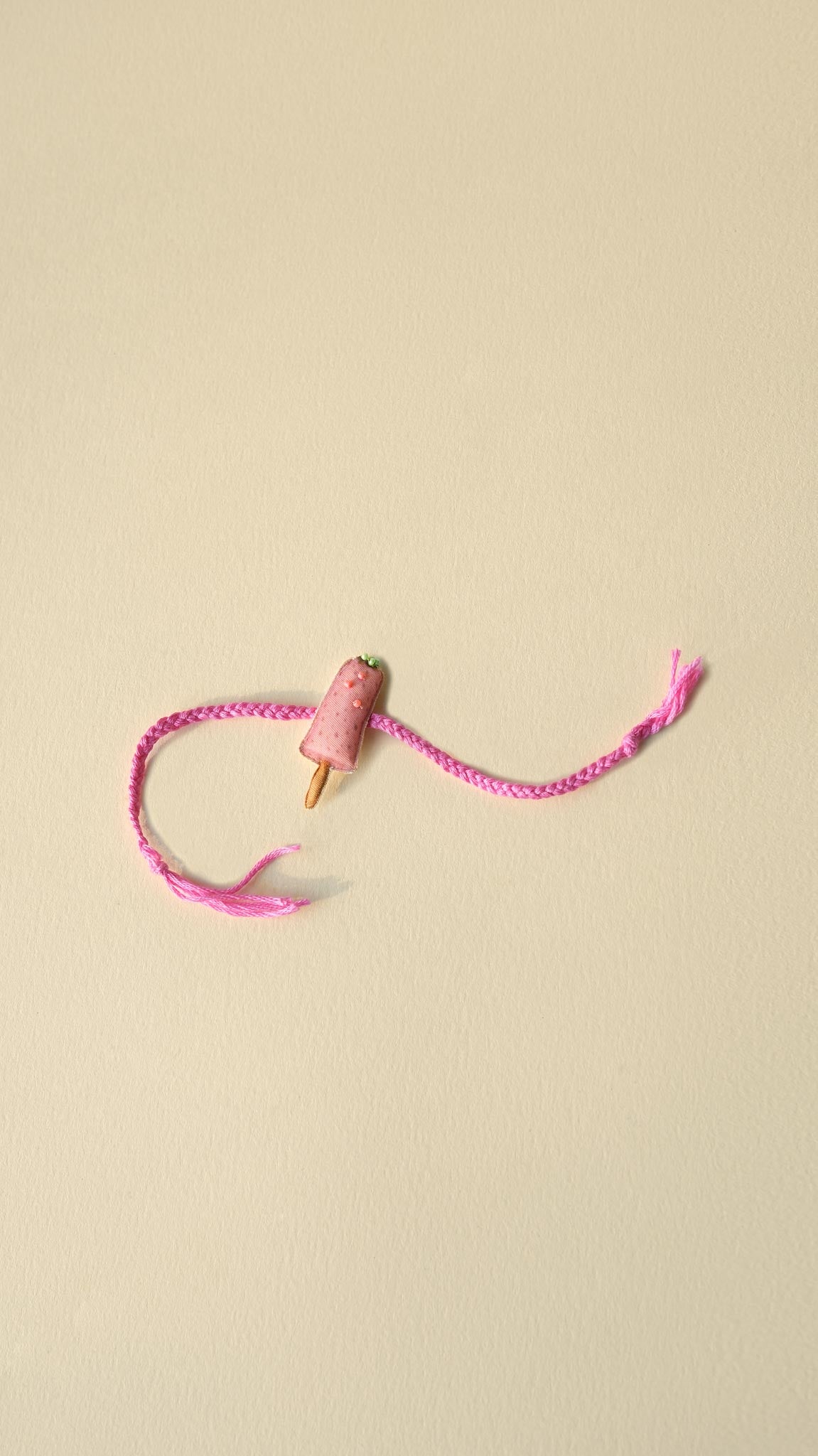 The Gulab Kulfi Rakhi is a miniature version of the beloved rosy kulfi-on-a-stick, complete with hand-embroidered details, tiny pink “falooda” beads, and a pistachio garnish on top. Finished with a soft pink thread, it’s the perfect way to celebrate the quirks and sweetness of siblinghood.