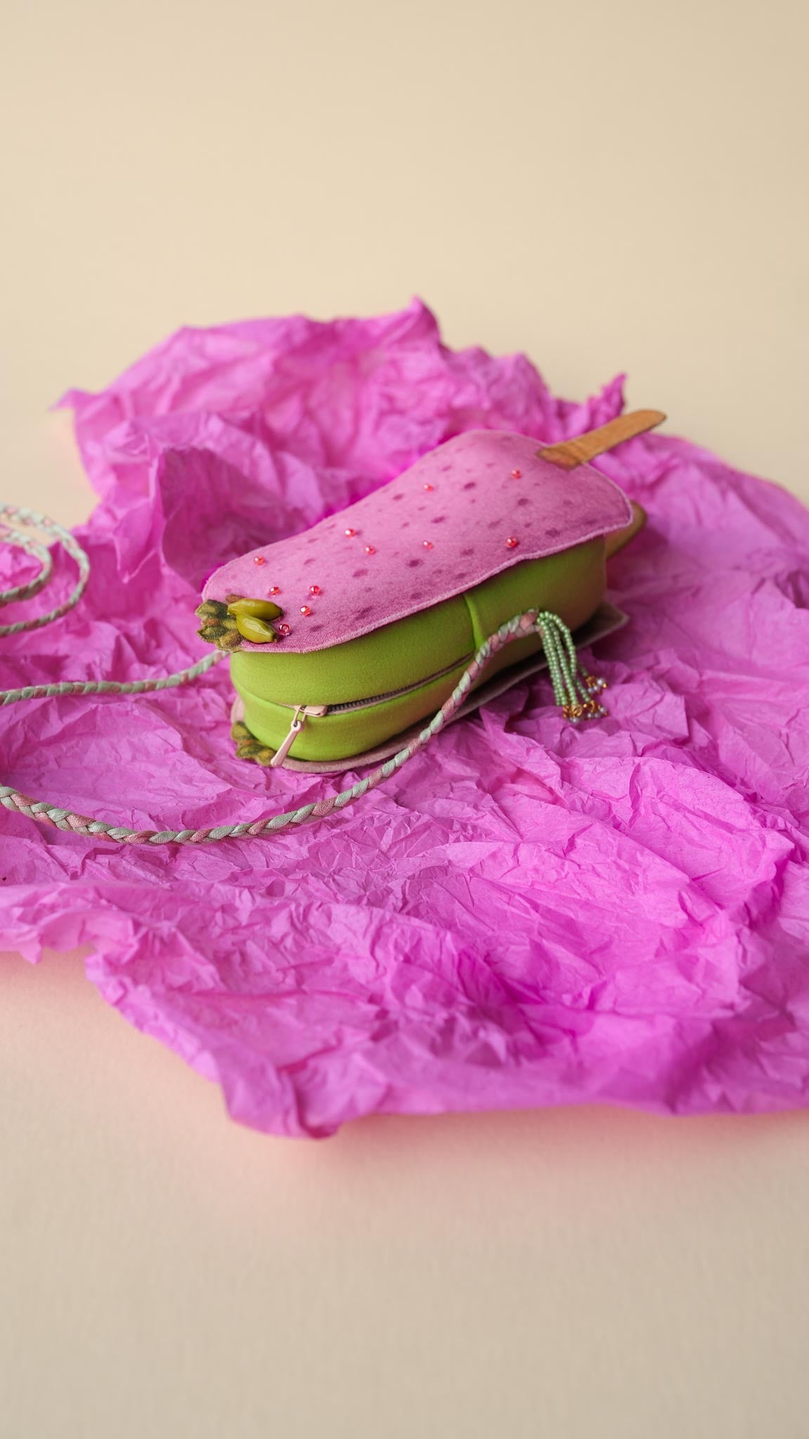 Our Gulab Kulfi Sling Bag is shaped like a rosy pink kulfi stick, complete with delicate beaded “falooda” and a pistachio topping. The fabric stick adds just the right amount of whimsy, and the pastel palette makes it wearable with both Indian and Western outfits.