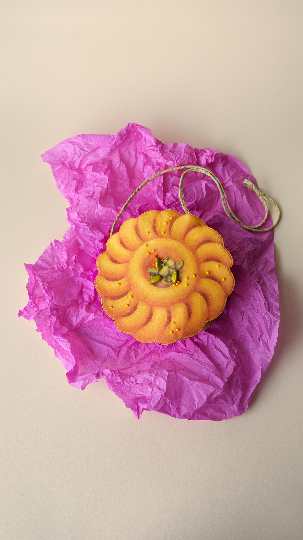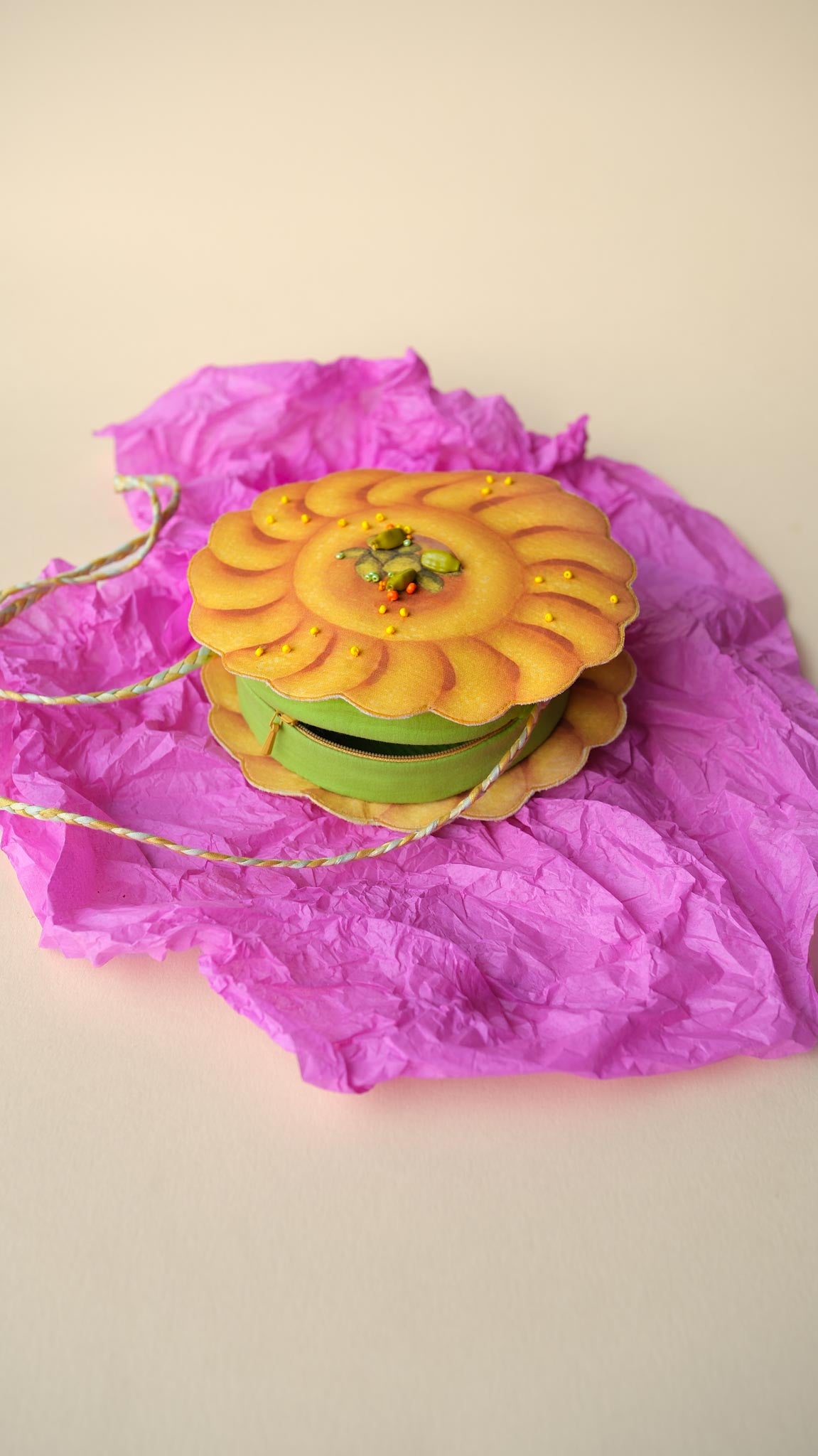 The Imarti Sling Bag is a delicious pop of sunshine in your child’s wardrobe. With its cheerful orange swirl, tiny bead “syrup” dots, and a pistachio centre, it’s crafted to look like the real thing (but don’t bite it!).