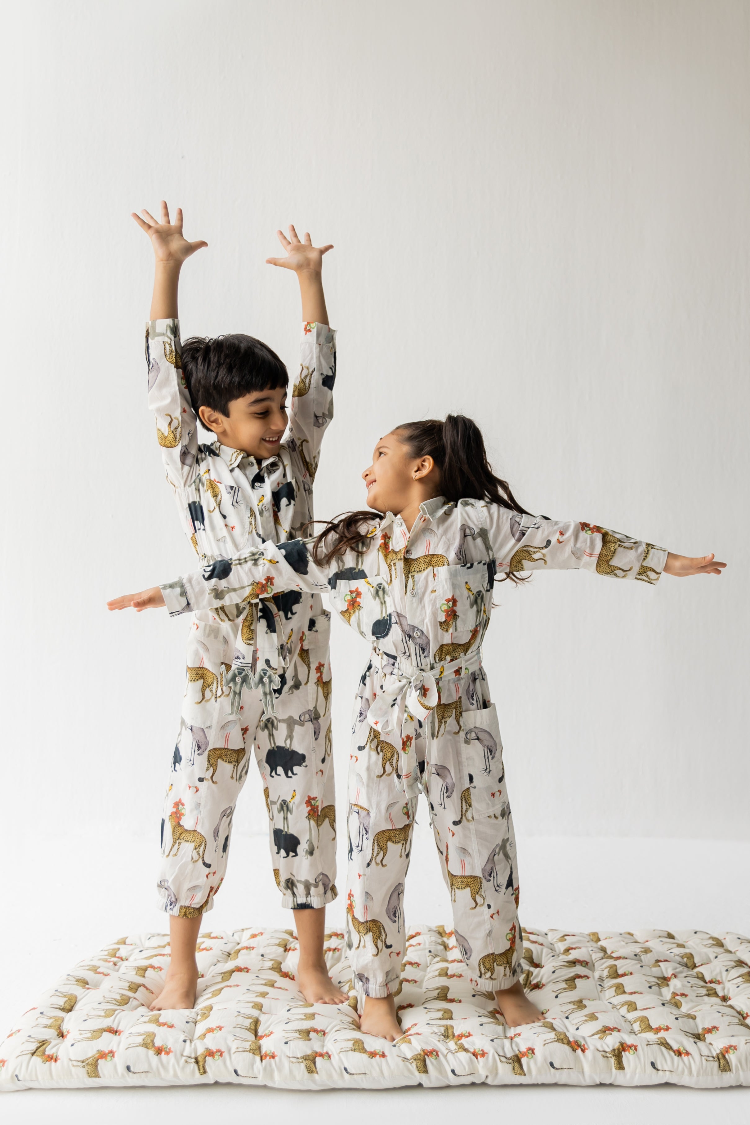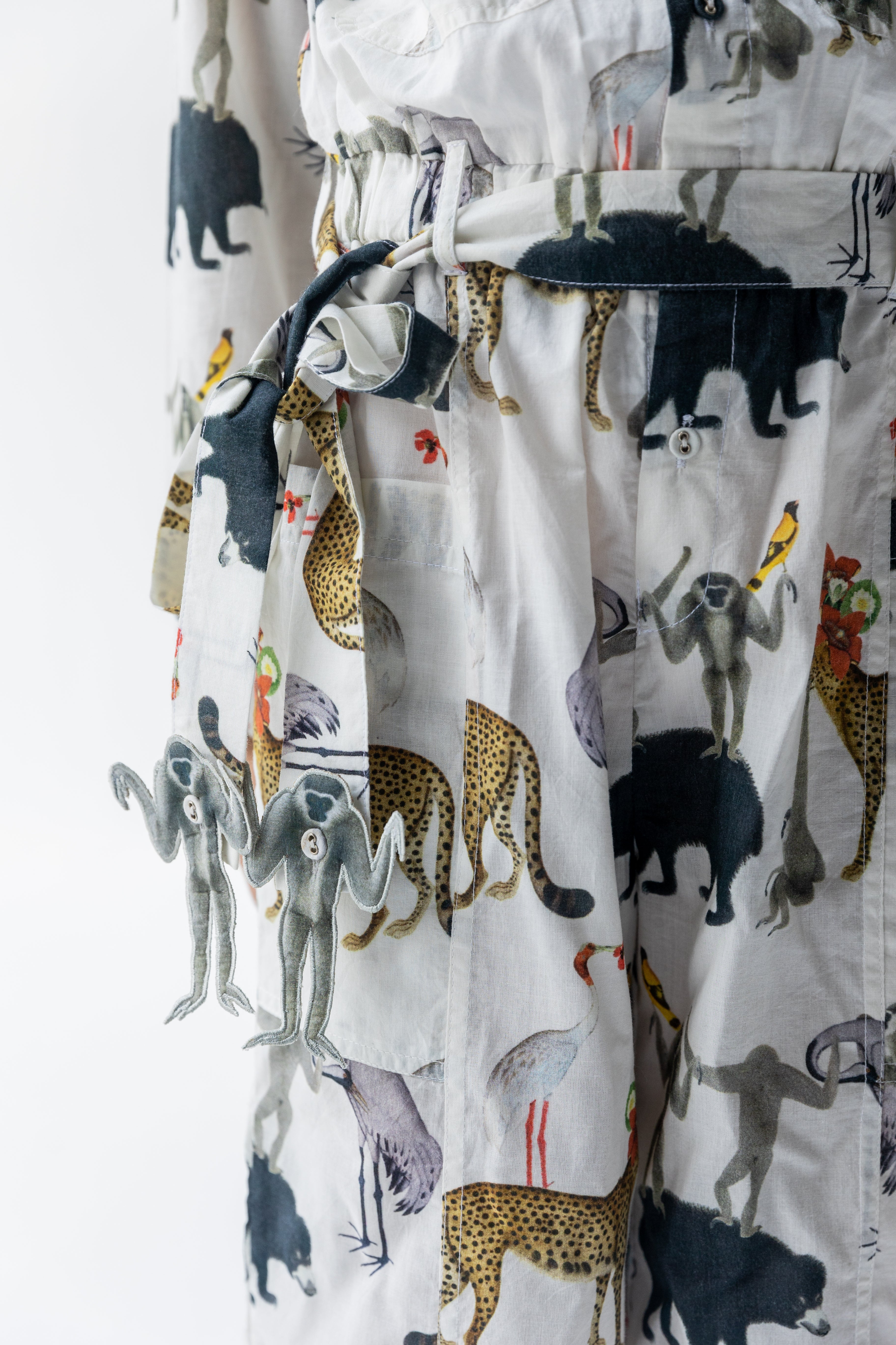 Ivory chidiya ghar ki sair print full sleeves jumpsuit with spread collared neckline and it comes with a belt has two brooches attached with buttons.