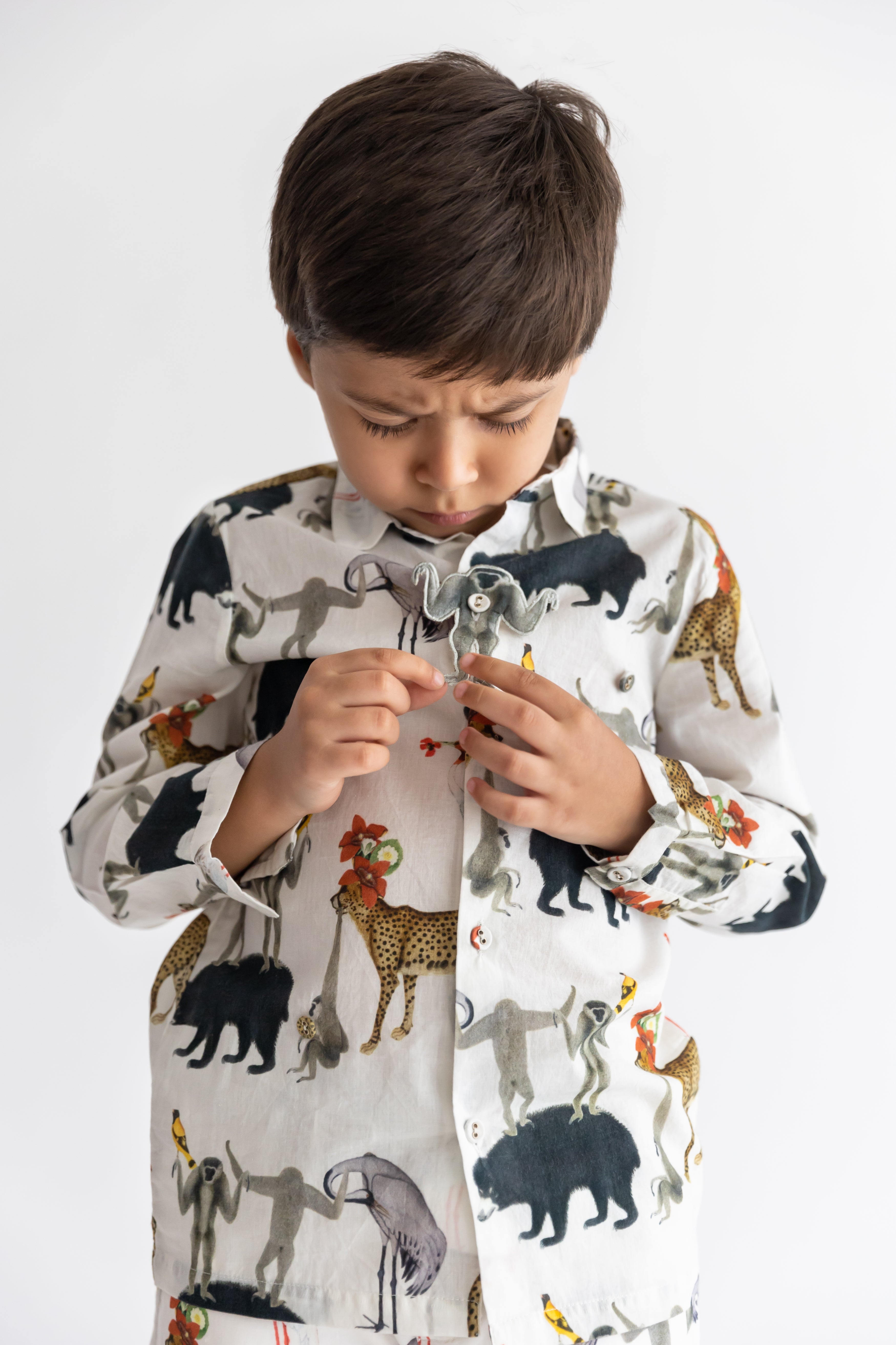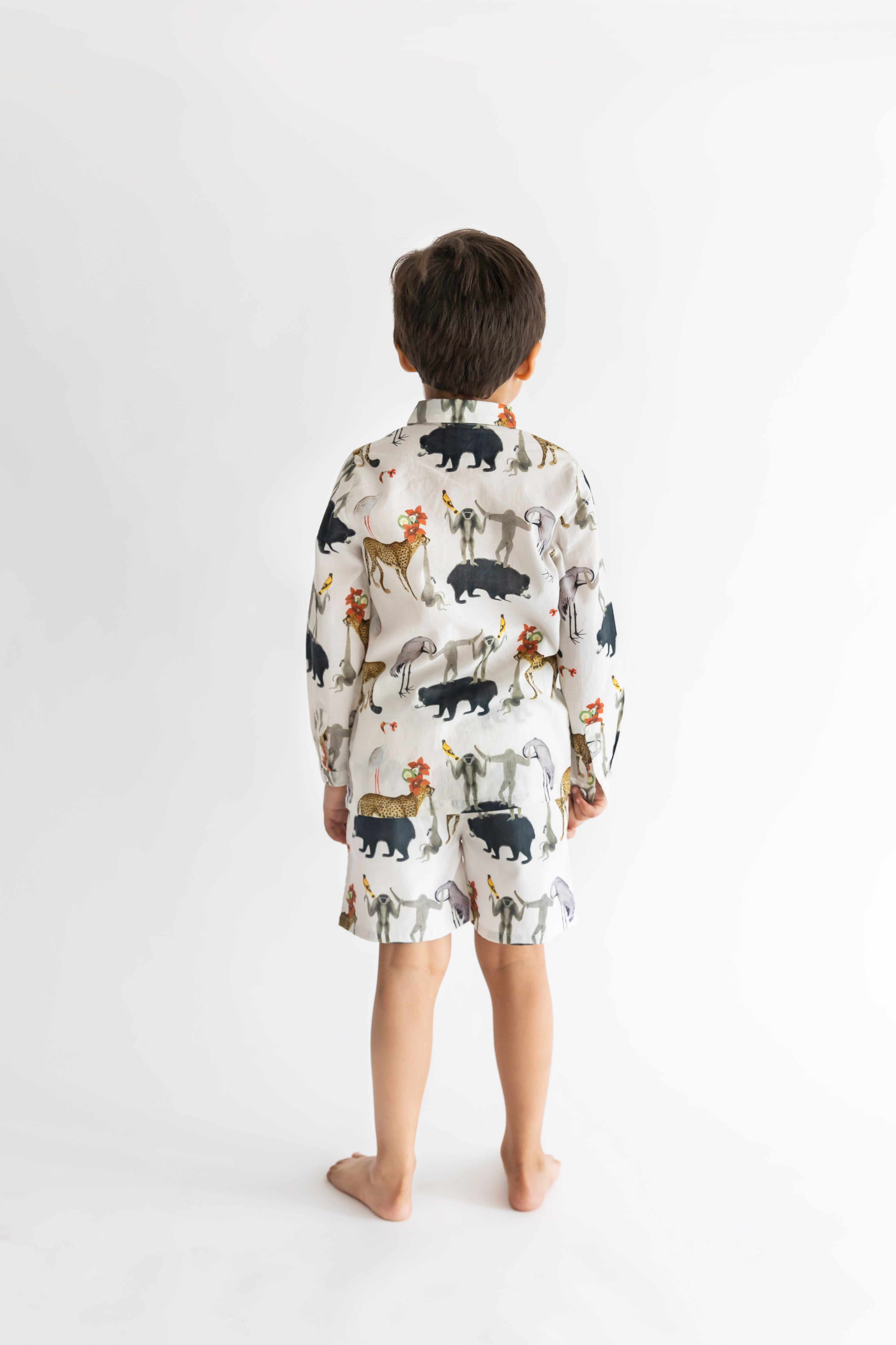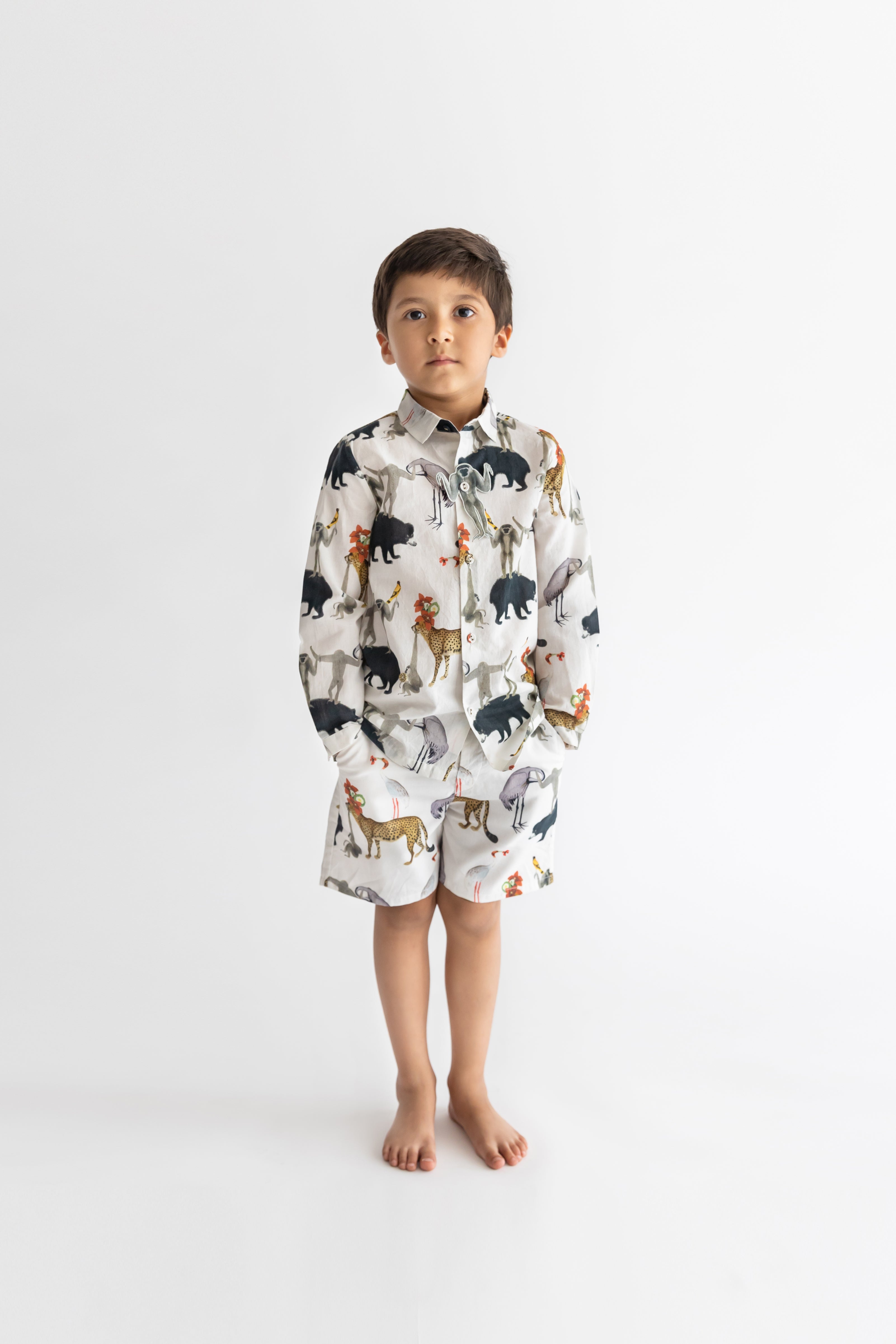 Ivory chidiya ghar ki sair print full sleeves shirt with two brooch placement paired with shorts has full elastic waist and side pockets.