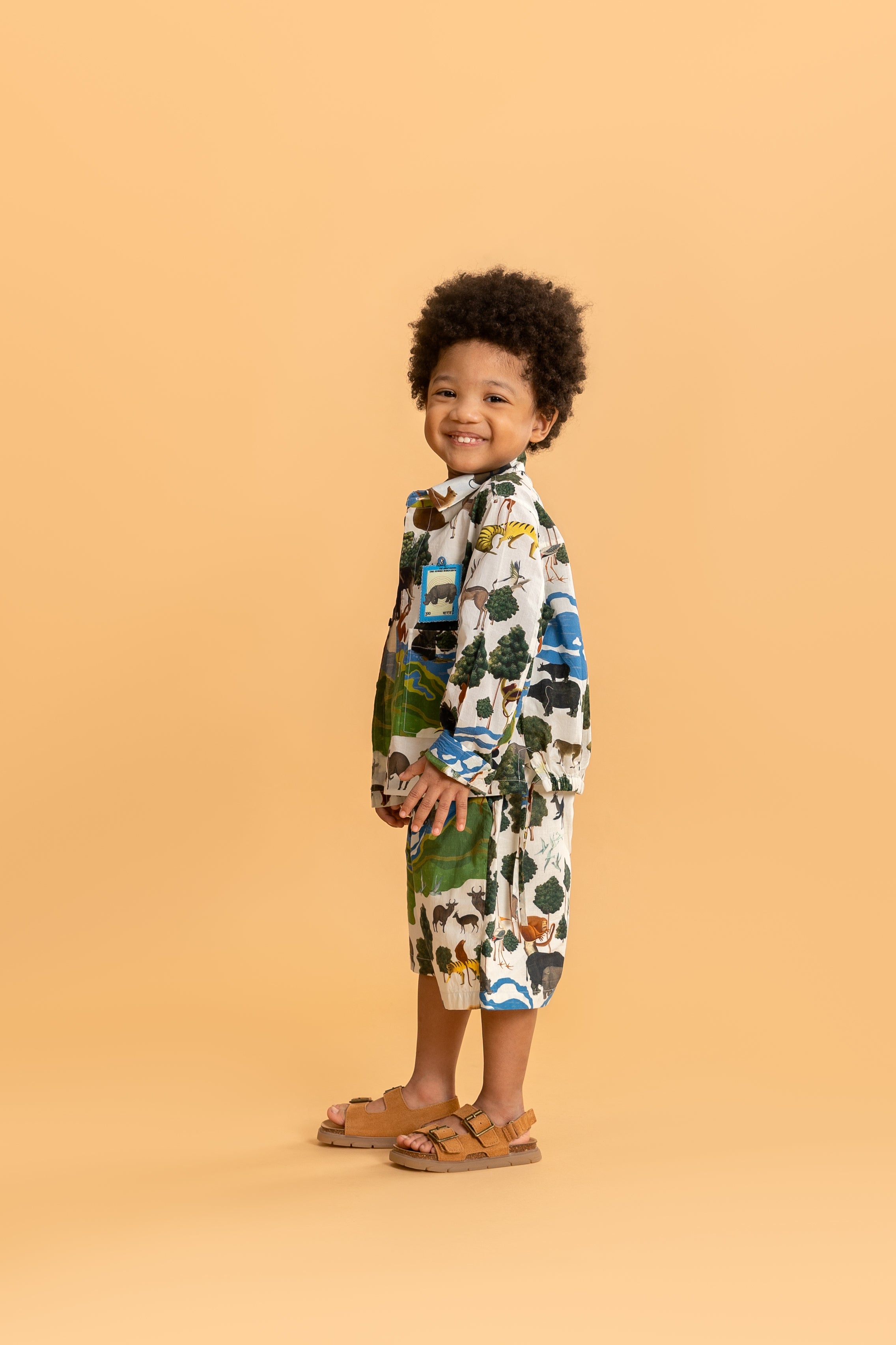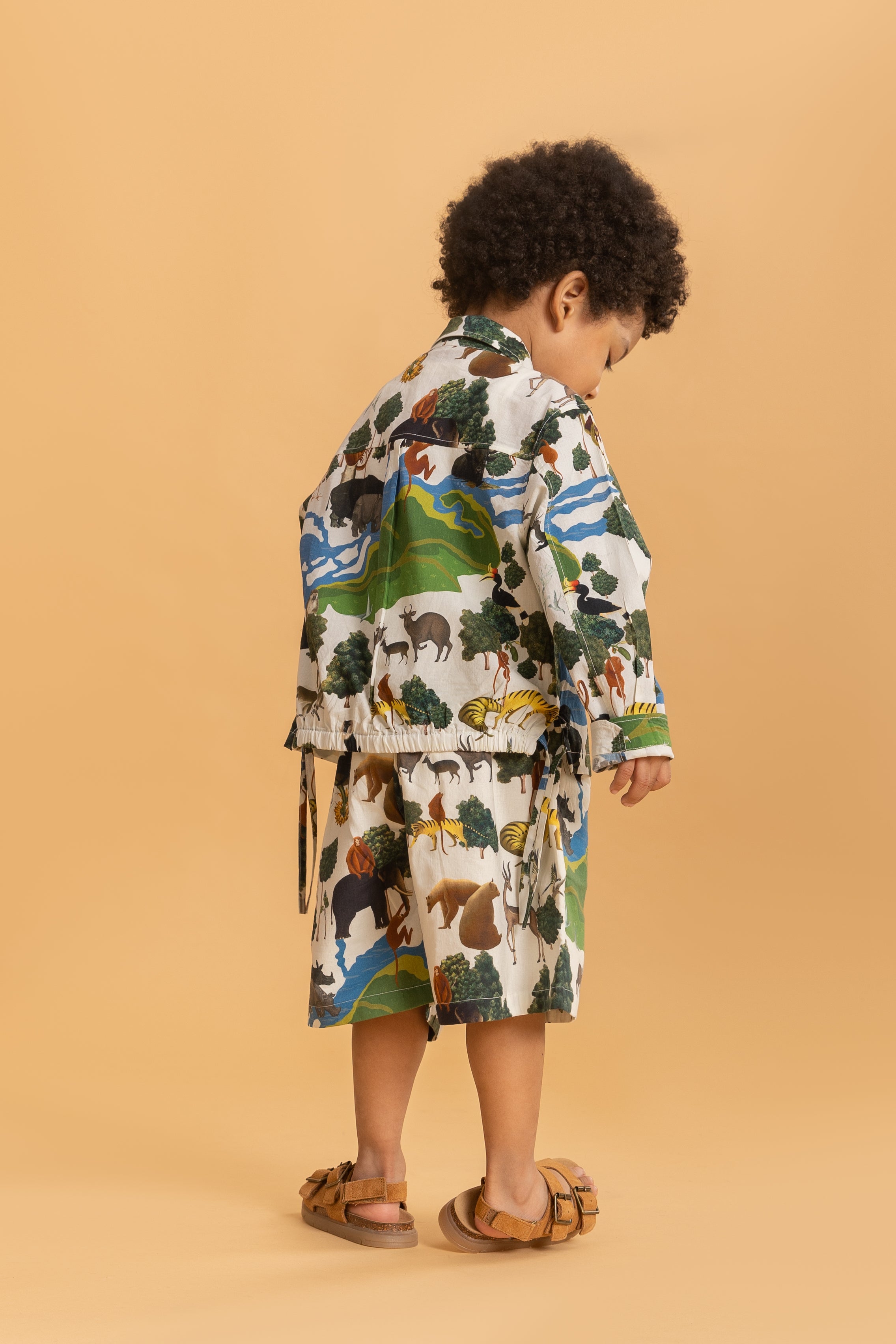 Ivory Kaziranga National Park print full sleeves relaxed fit shacket with patch pockets. It comes with a playful machine embroidered brooch.