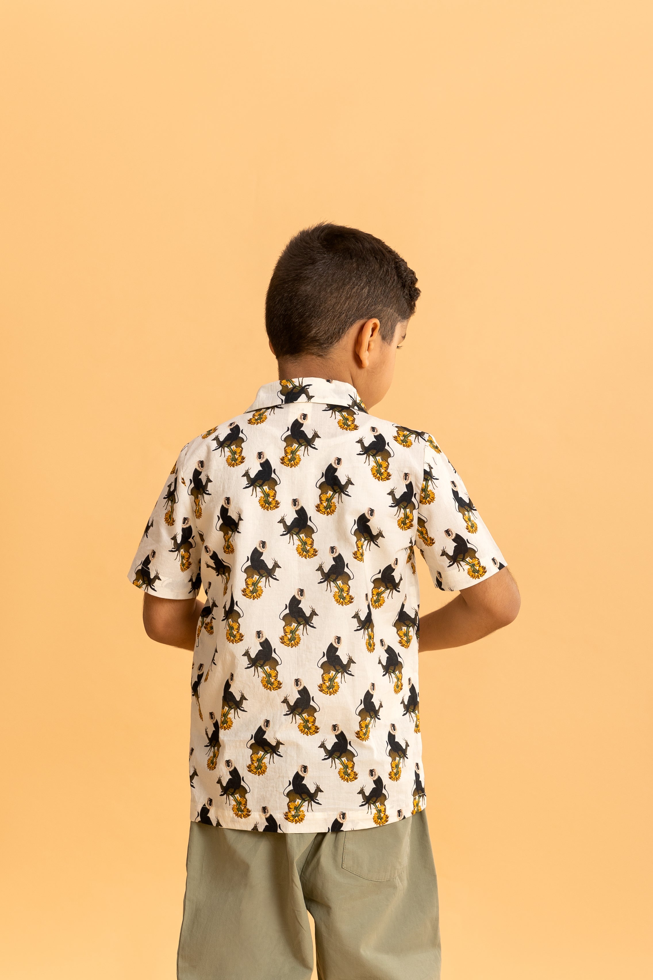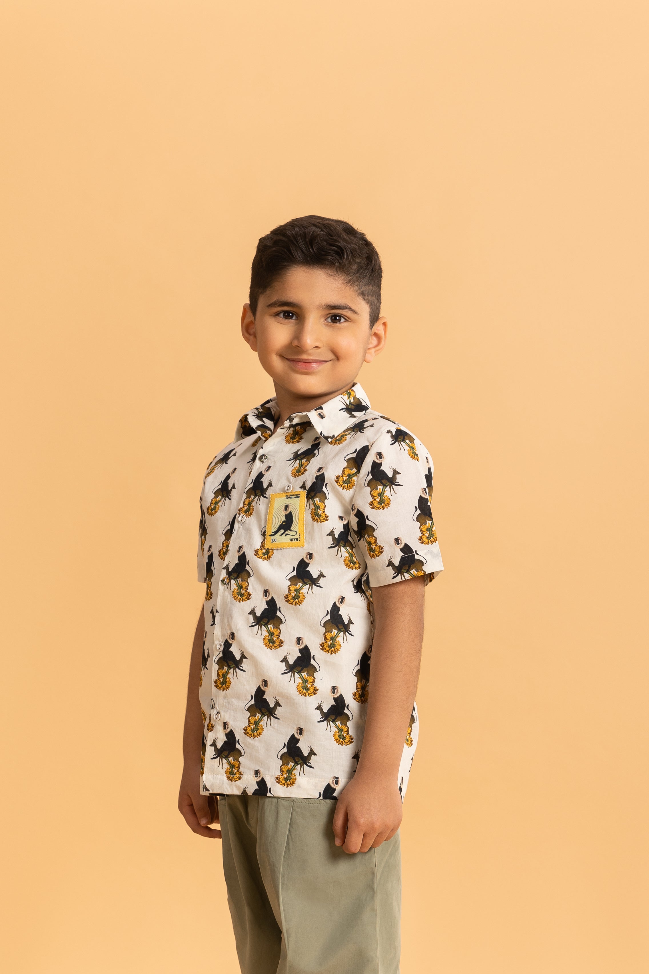 Ivory Kela Chor Langur print half sleeves shirt with comes with a playful machine embroidered brooch.