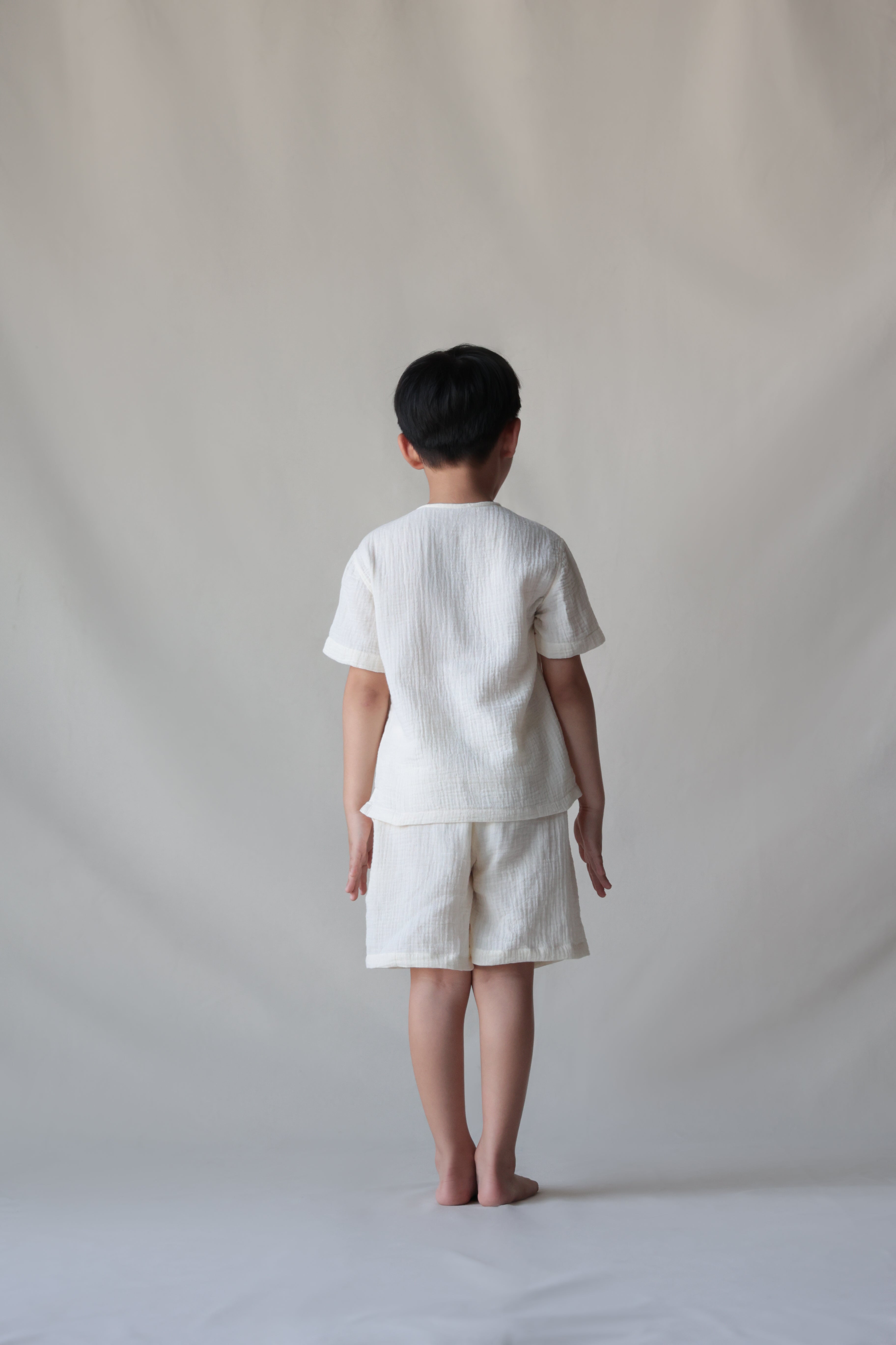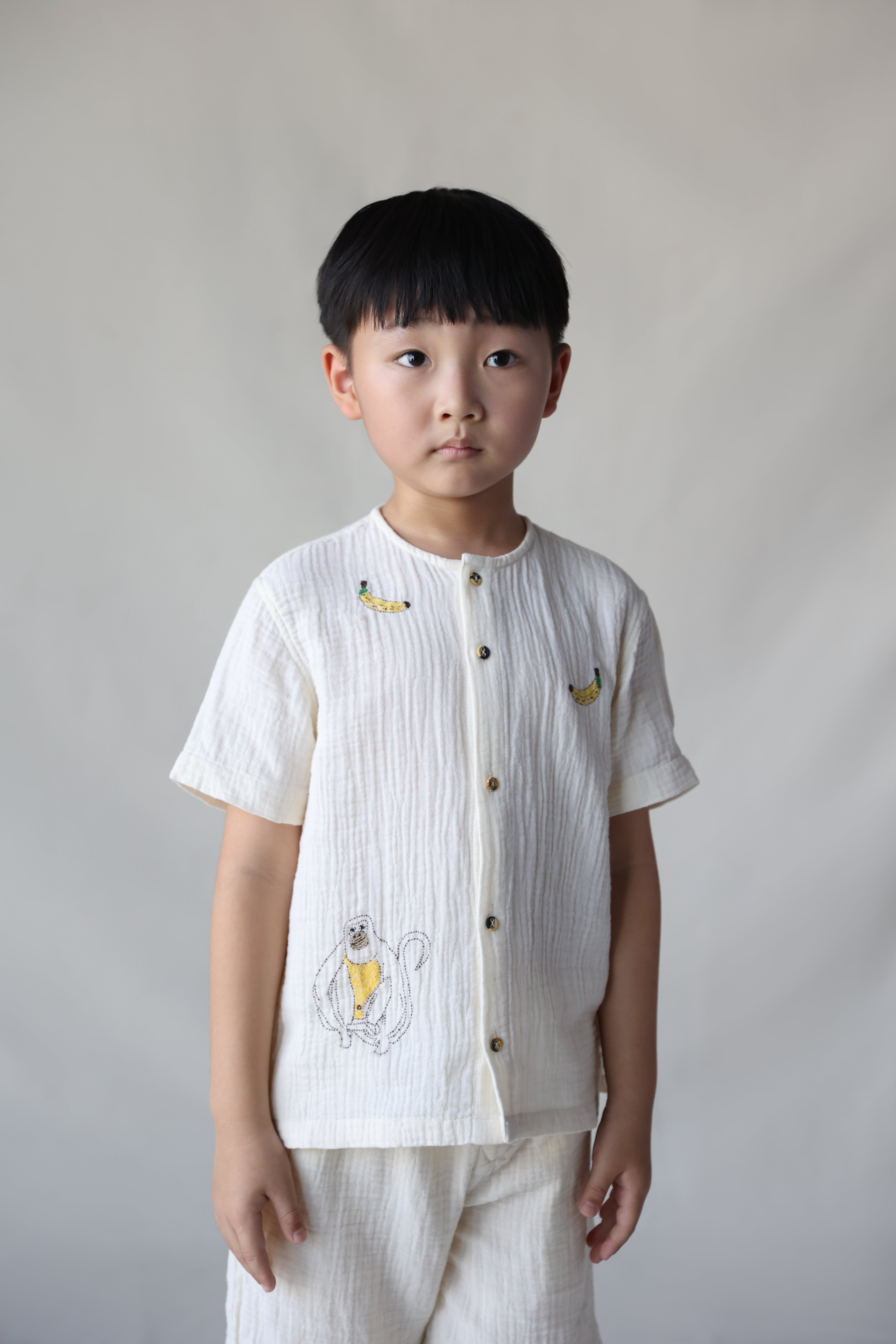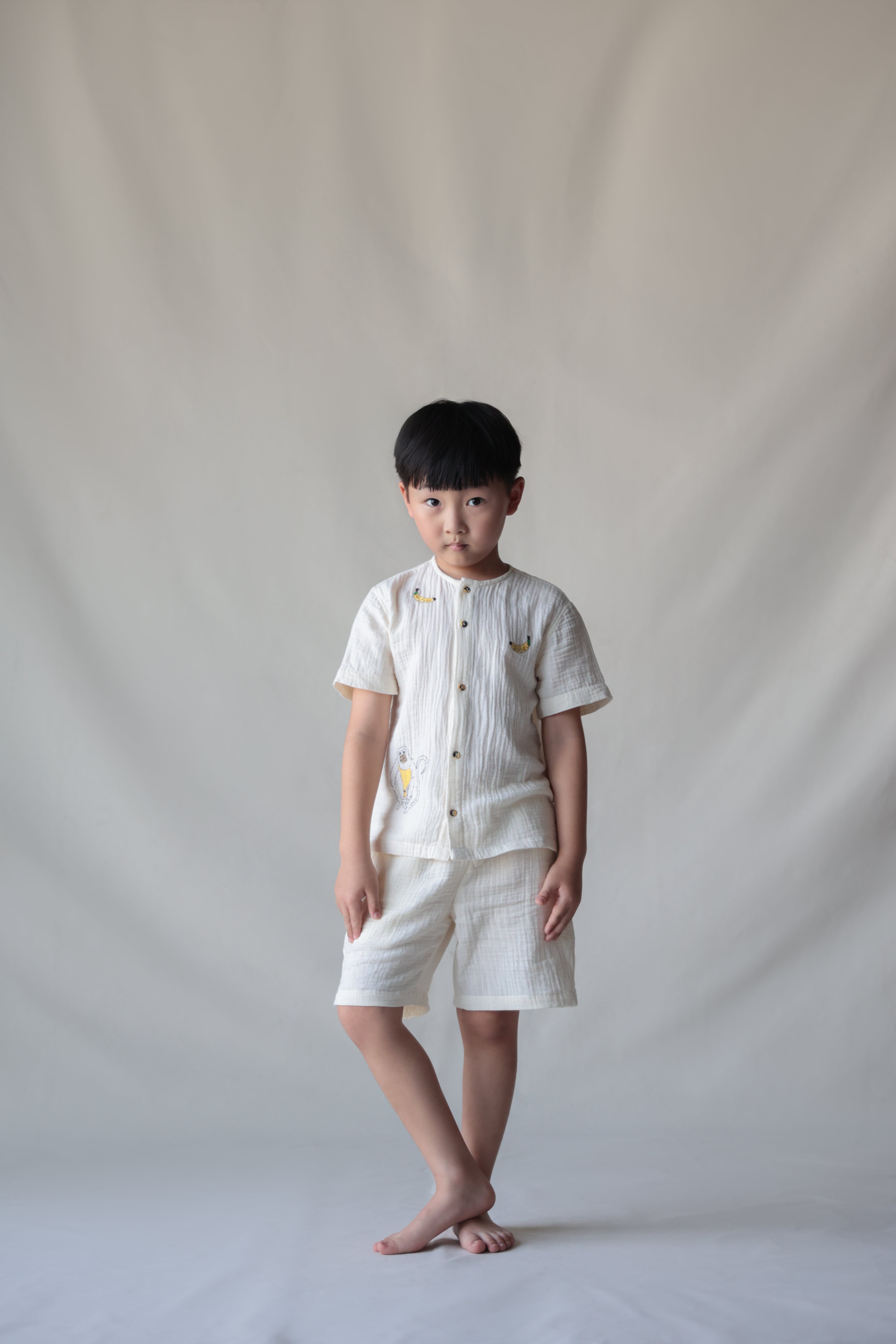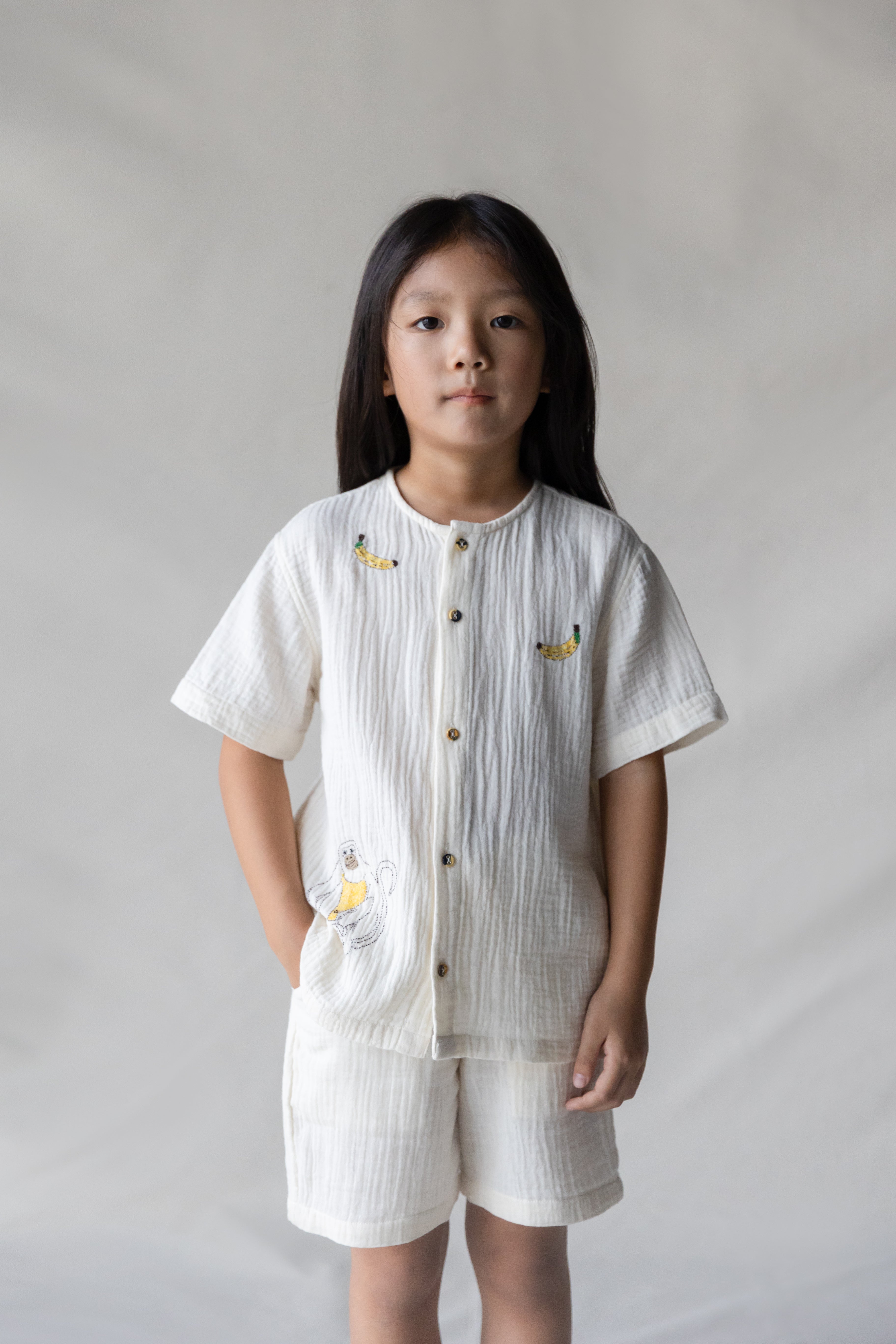 Hand embroidered Natkhat bandar adds true charm to this 100% organic cotton ivory shirt and shorts. Designed to be worn as a set or mixed and matched. Whether for a day at the park or a special occasion, this set is perfect for any summer activity. Gender Neutral. Pre washed and pre shrunk.
