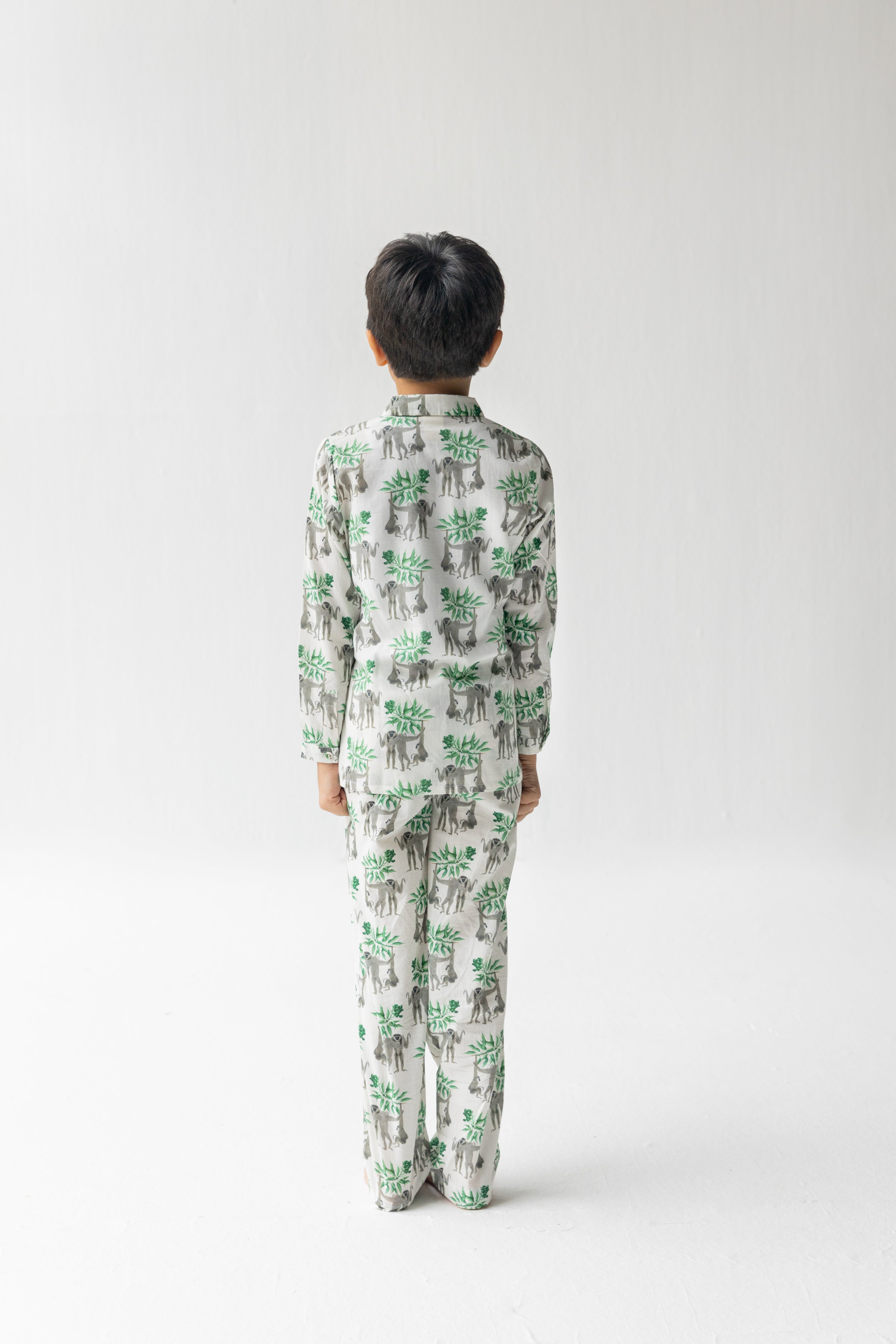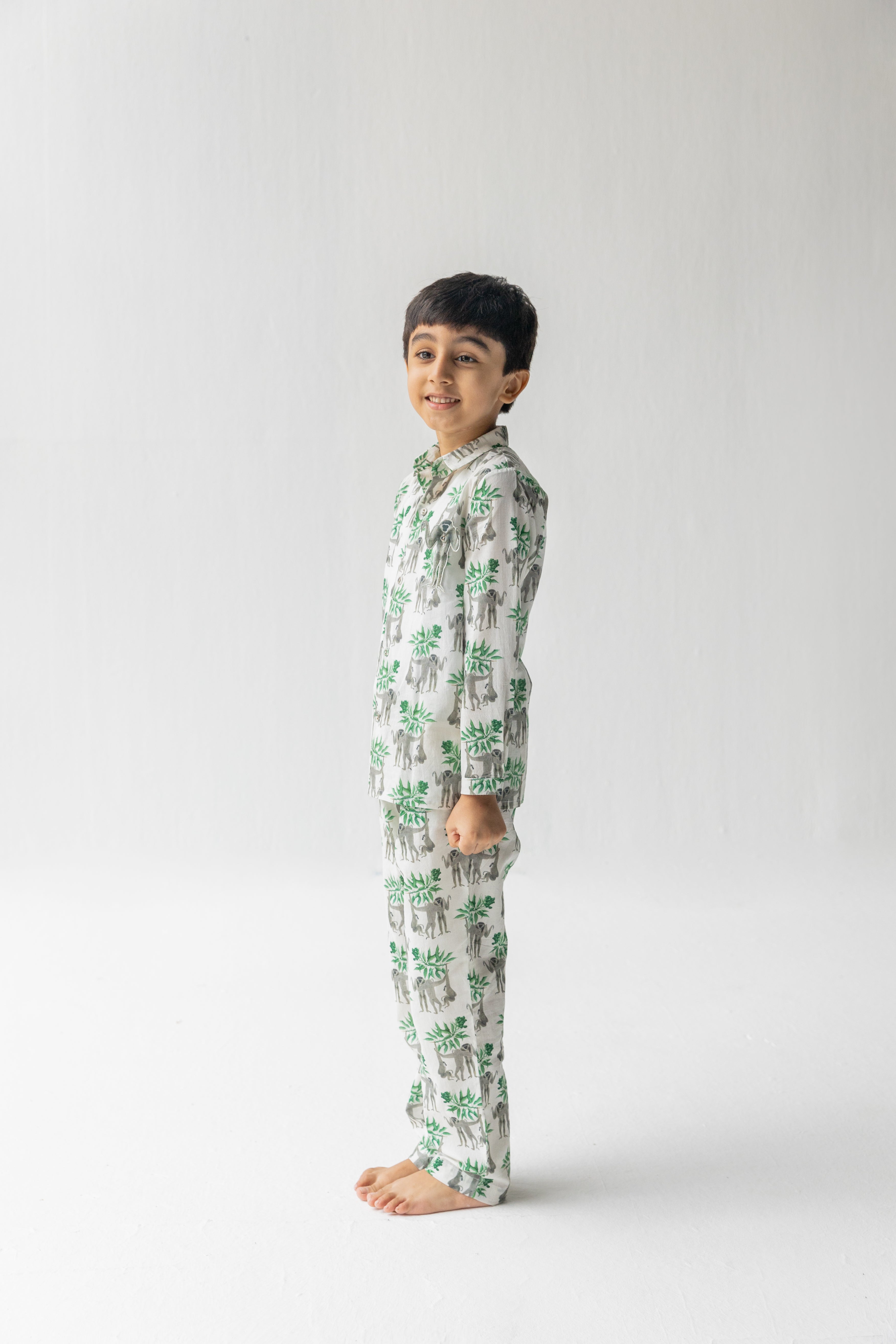 Ivory shararti bandar print full sleeves shirt with two brooch placements paired with pants has a full elastic waist and side pockets.
