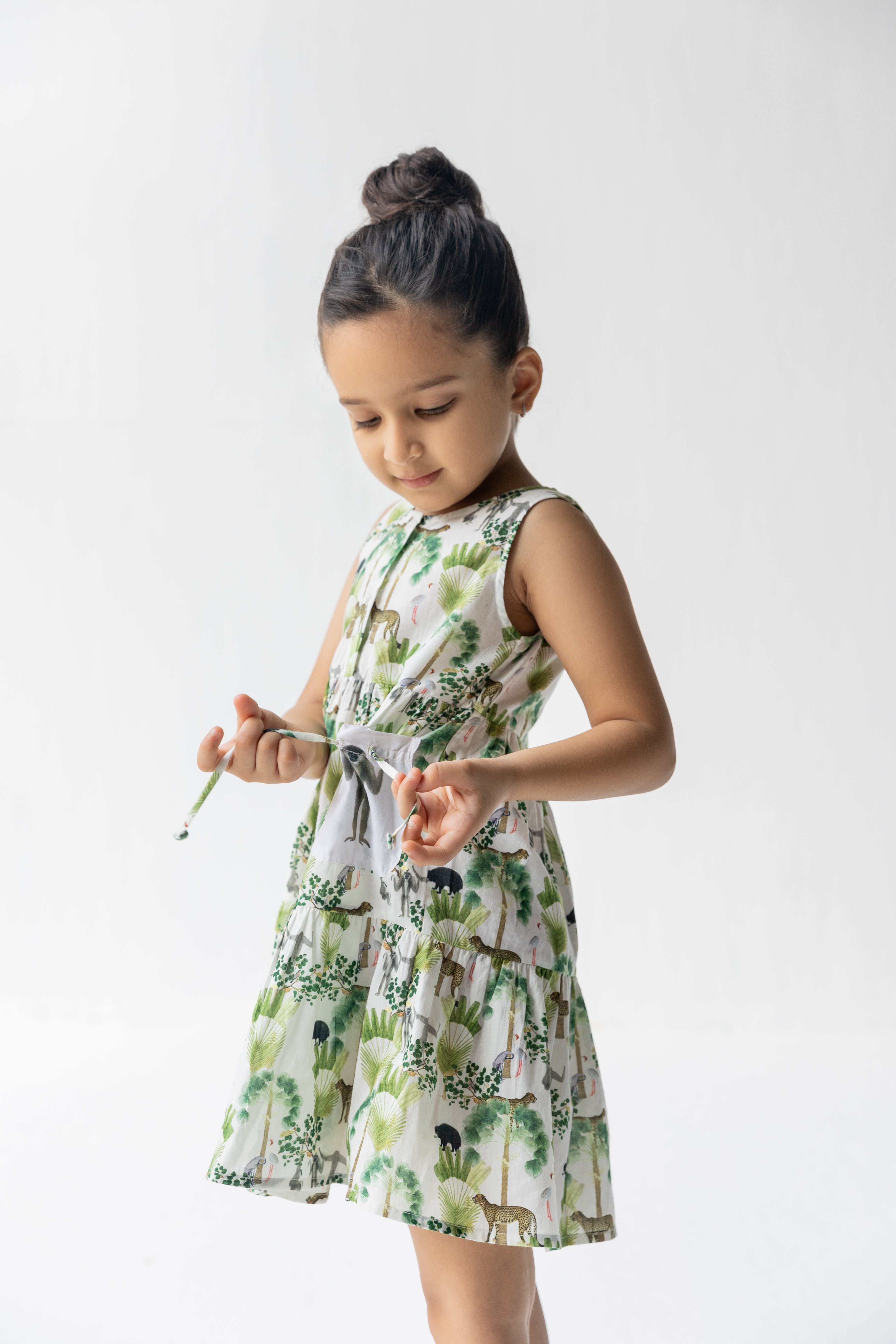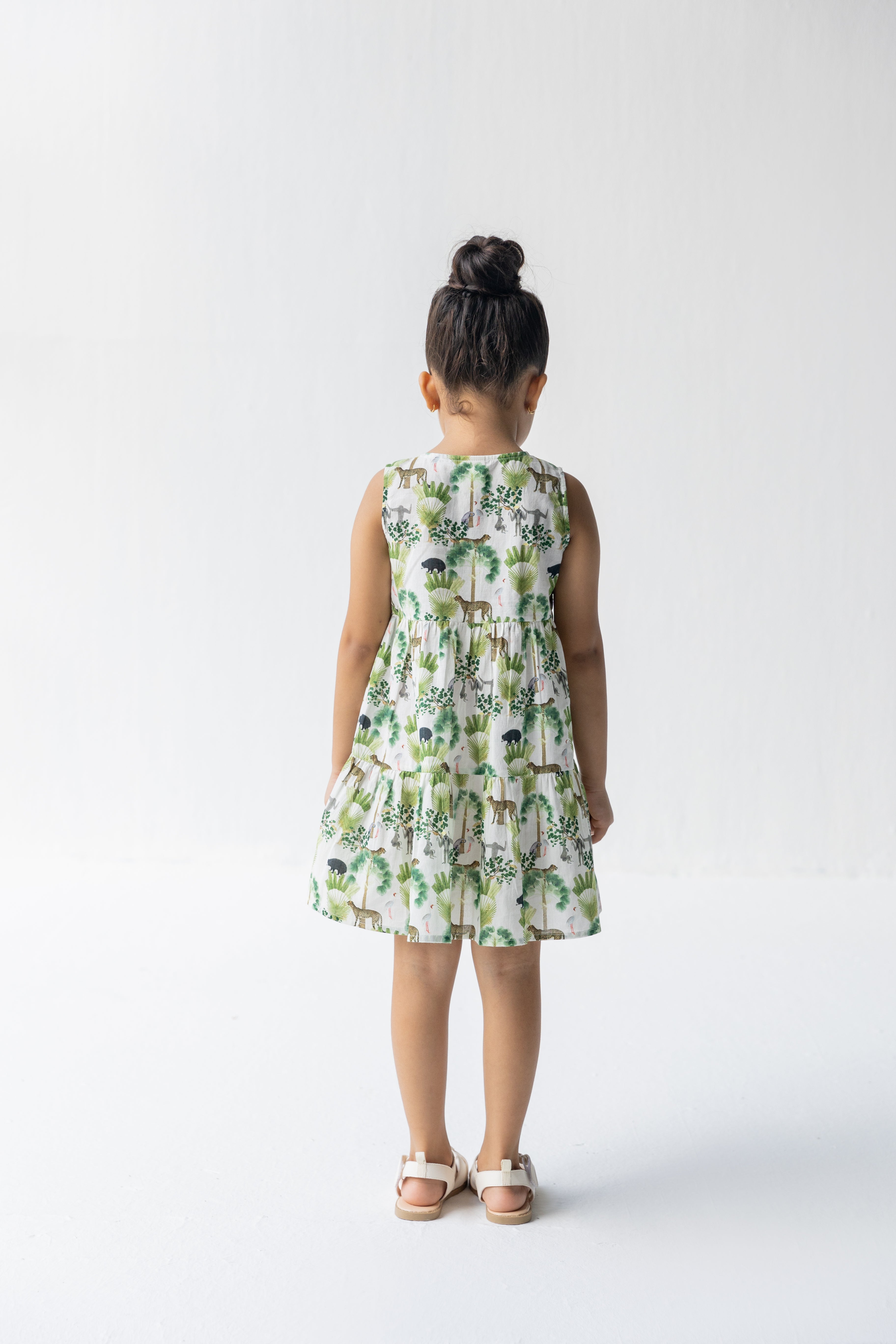 Ivory sunderban print tier maxi dress has a round neckline and is sleeveless with a shoulder button opening.