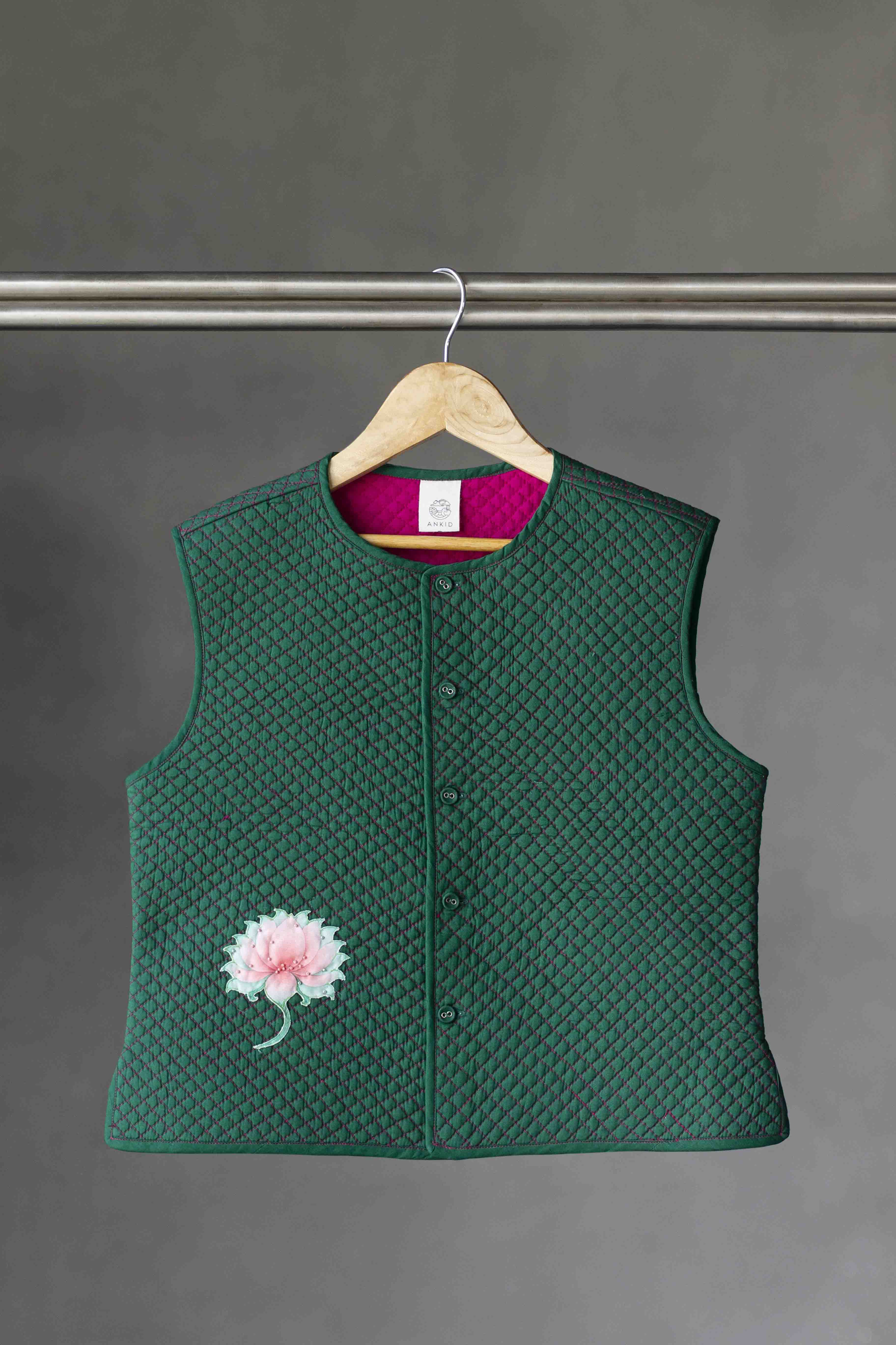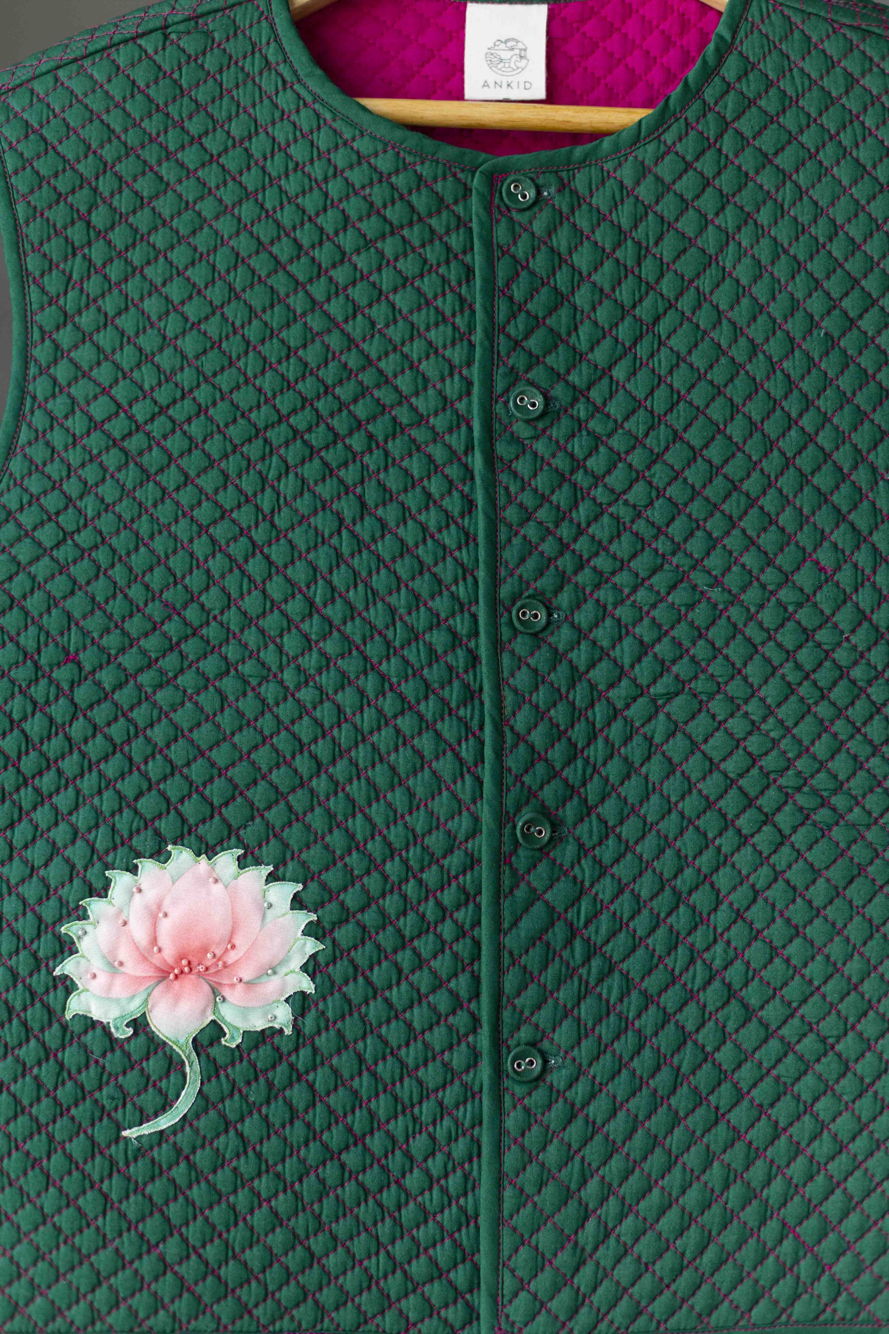 Designed in a striking emerald green, this bandi is quilted in 100% cotton, offering both comfort and structure. A hand-appliquéd lotus blooms softly against the textured surface, symbolizing purity and devotion amidst festivity.