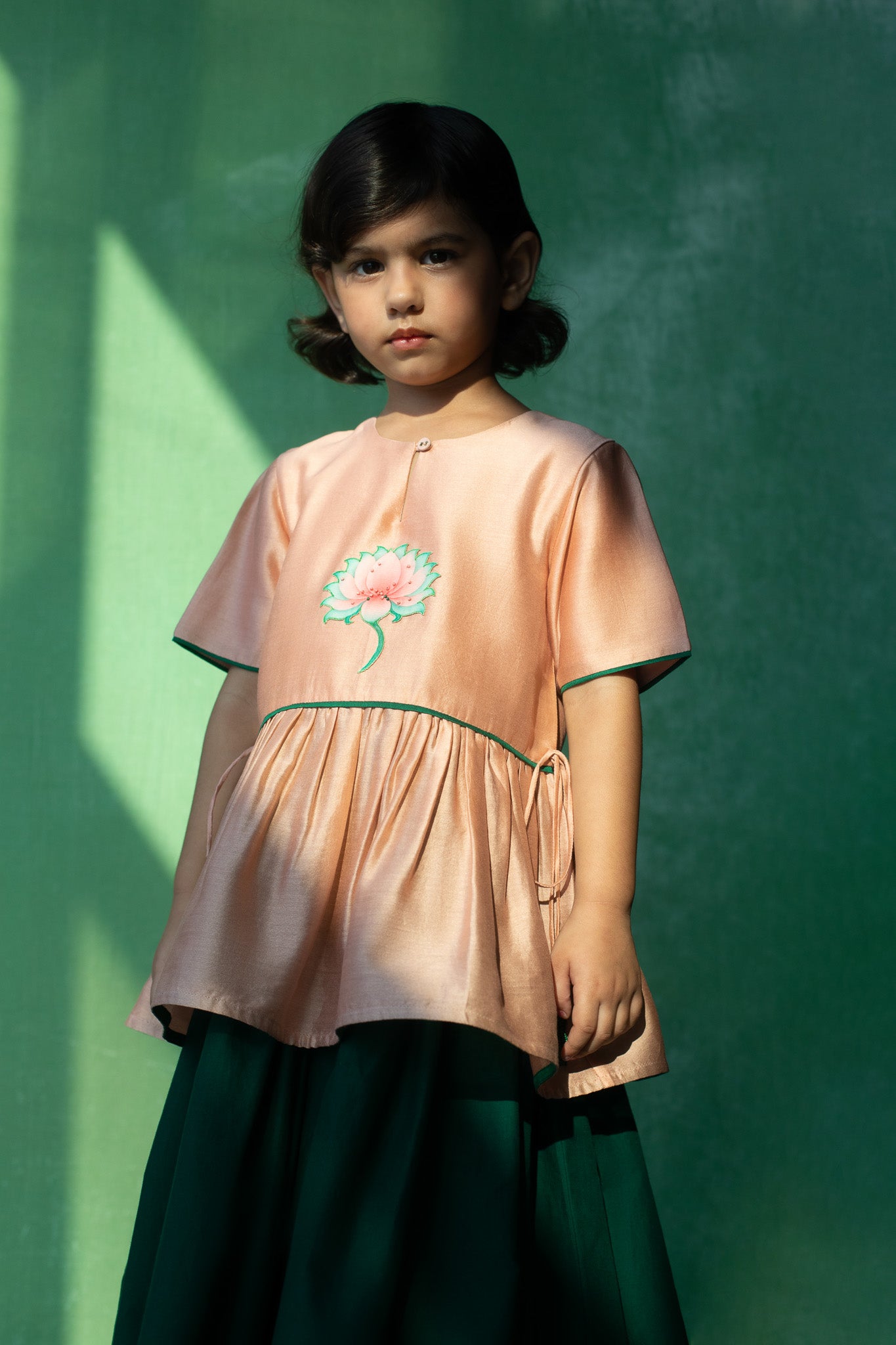 Lehenga: A deep emerald green lehenga in soft cotton, designed for comfort, twirl, and playful movement.