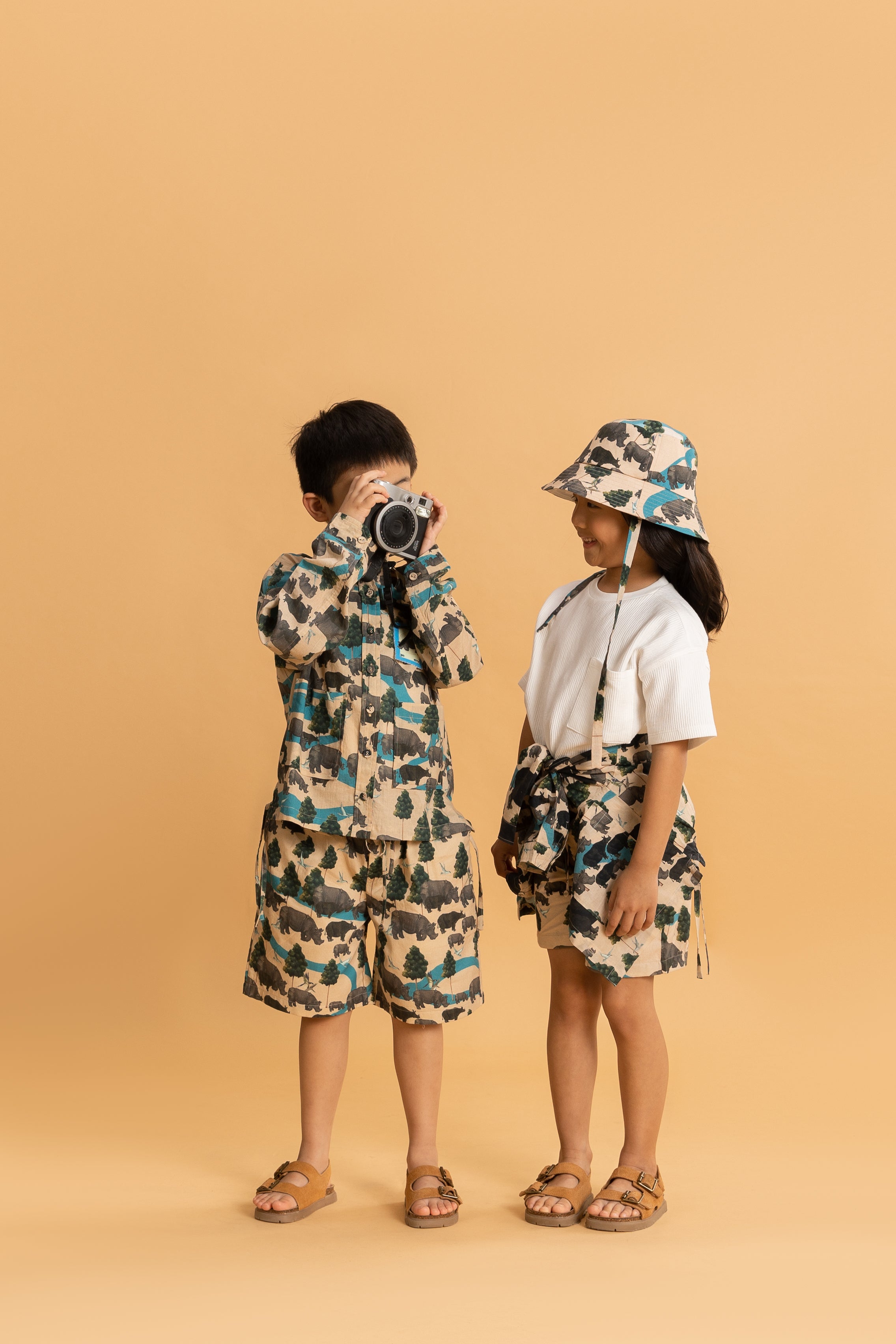 Latte Chimti aur Genda print bermuda shorts with an elasticated waistband and a front button fastening. Side pocket detail.