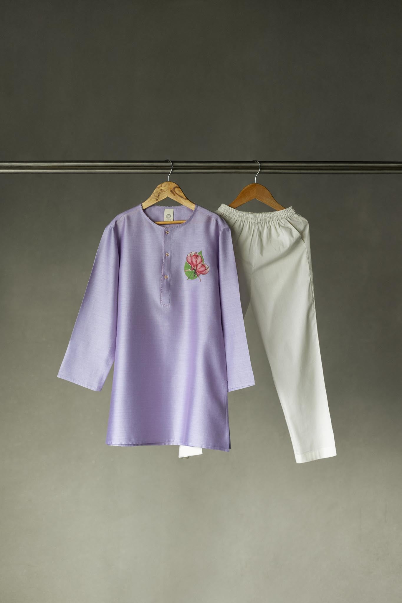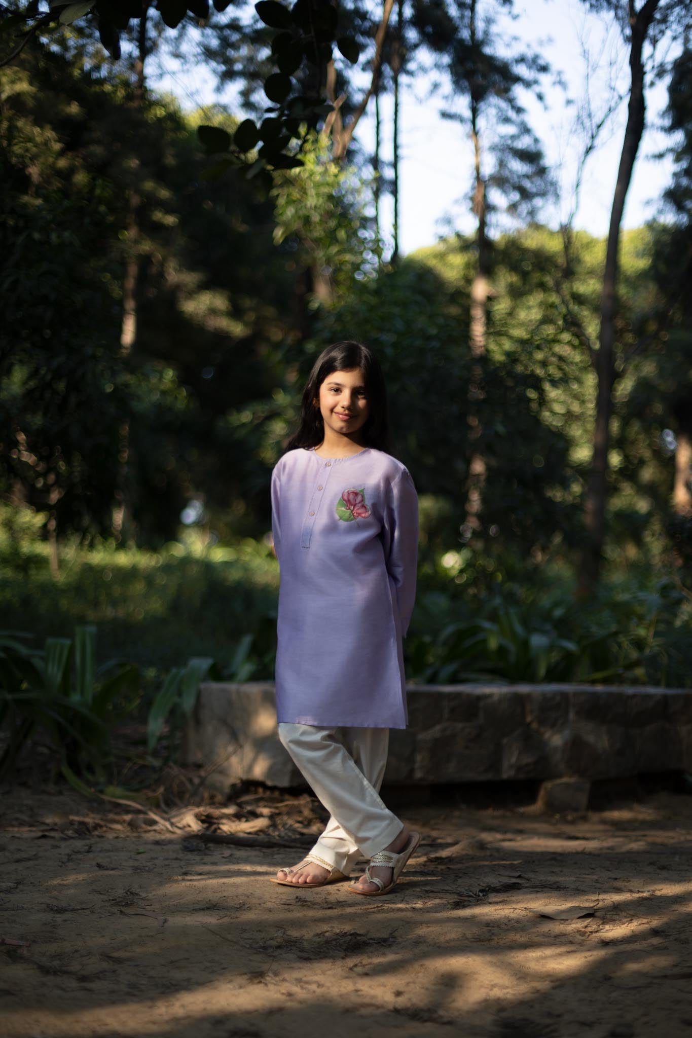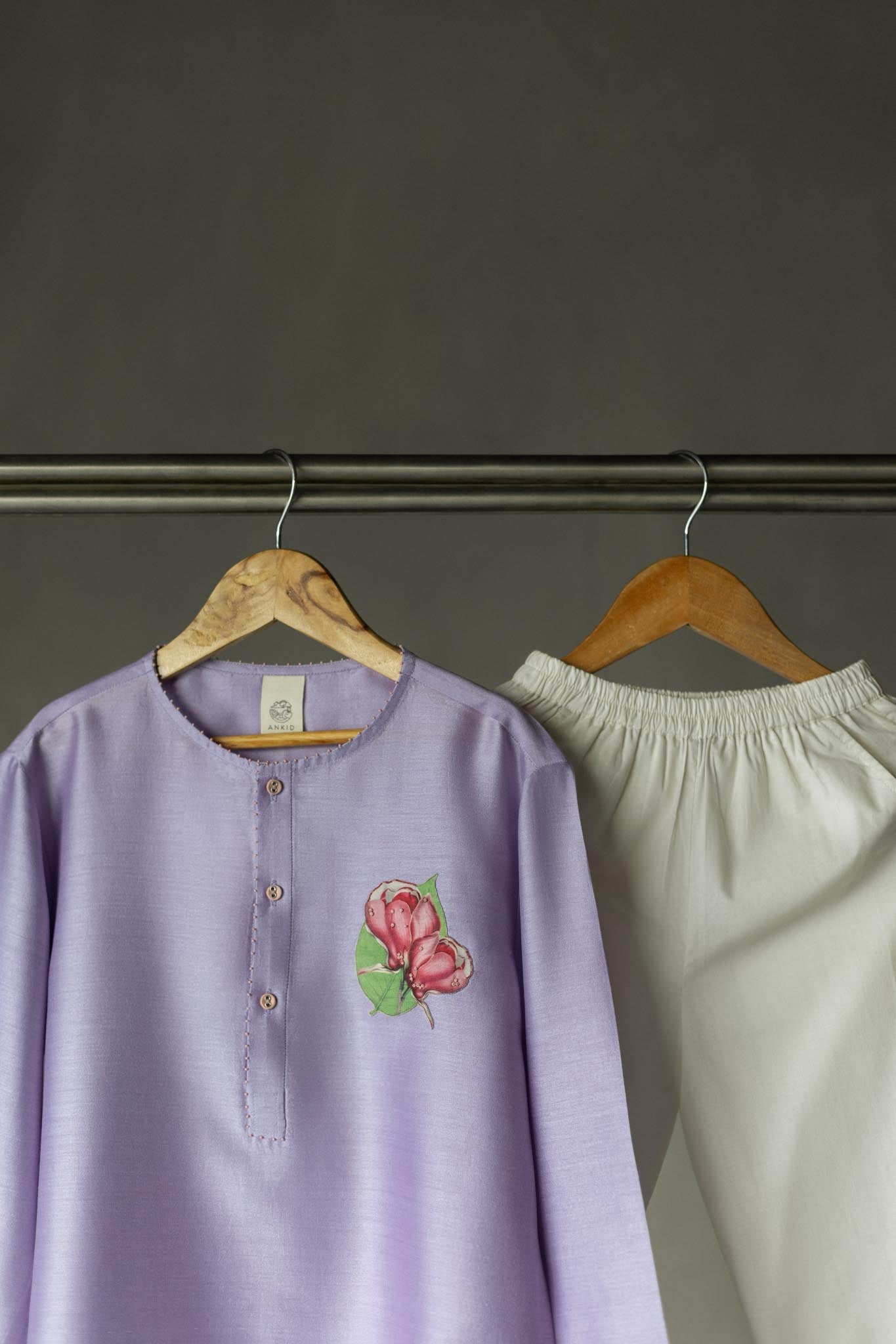 Lilac kurta has round neckline with blush bead detailings and hand-applique embroidery brooch, is paired with an ivory cotton pyjama.