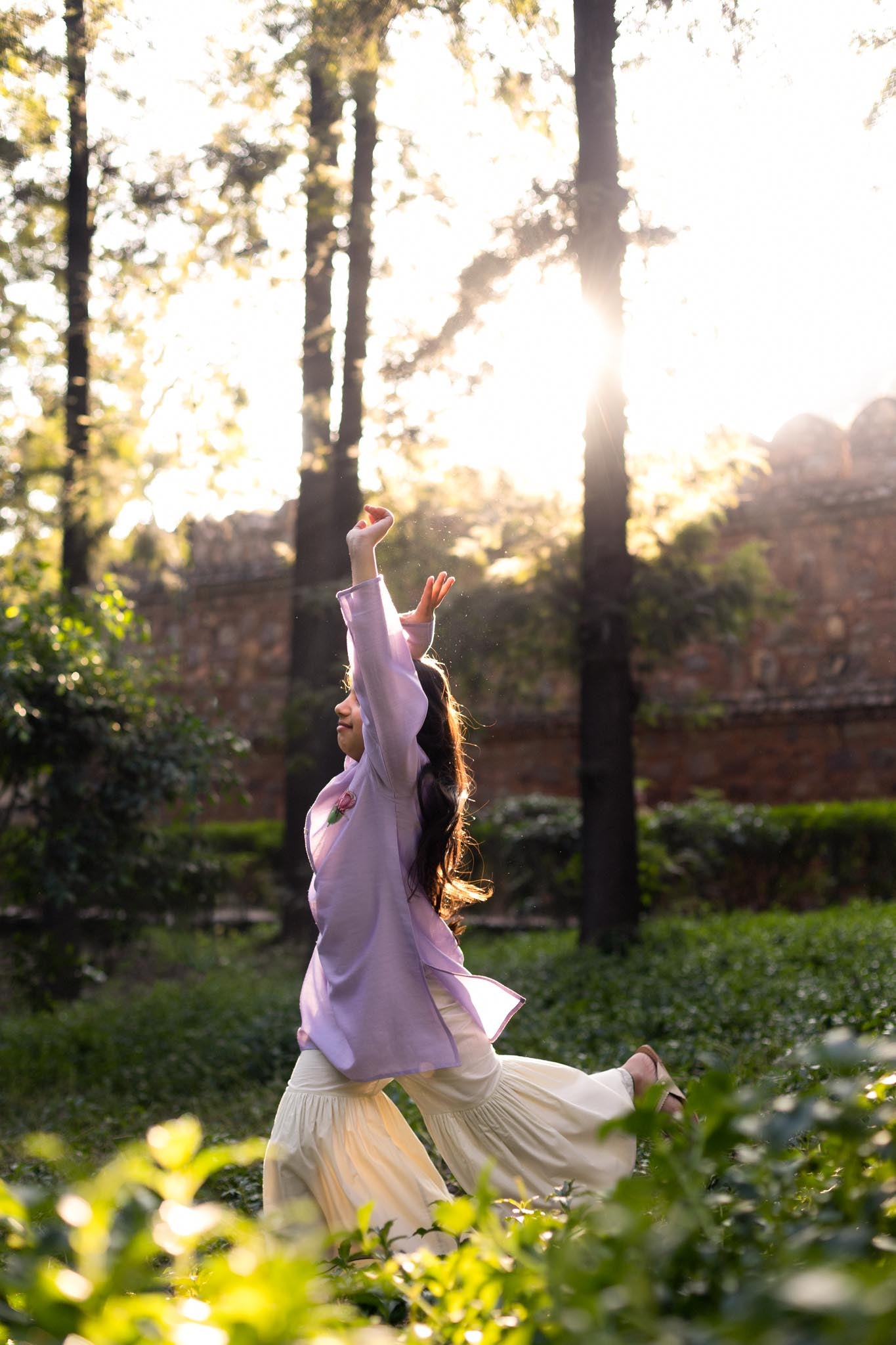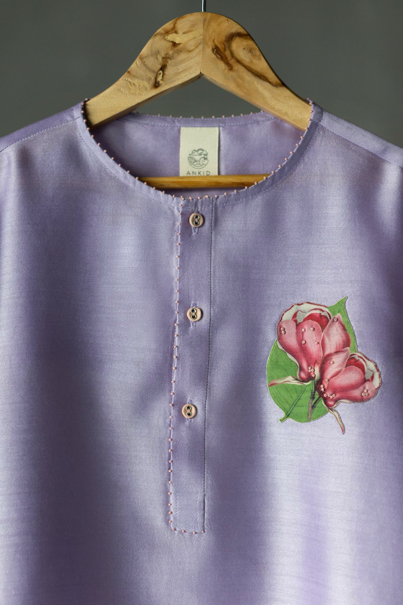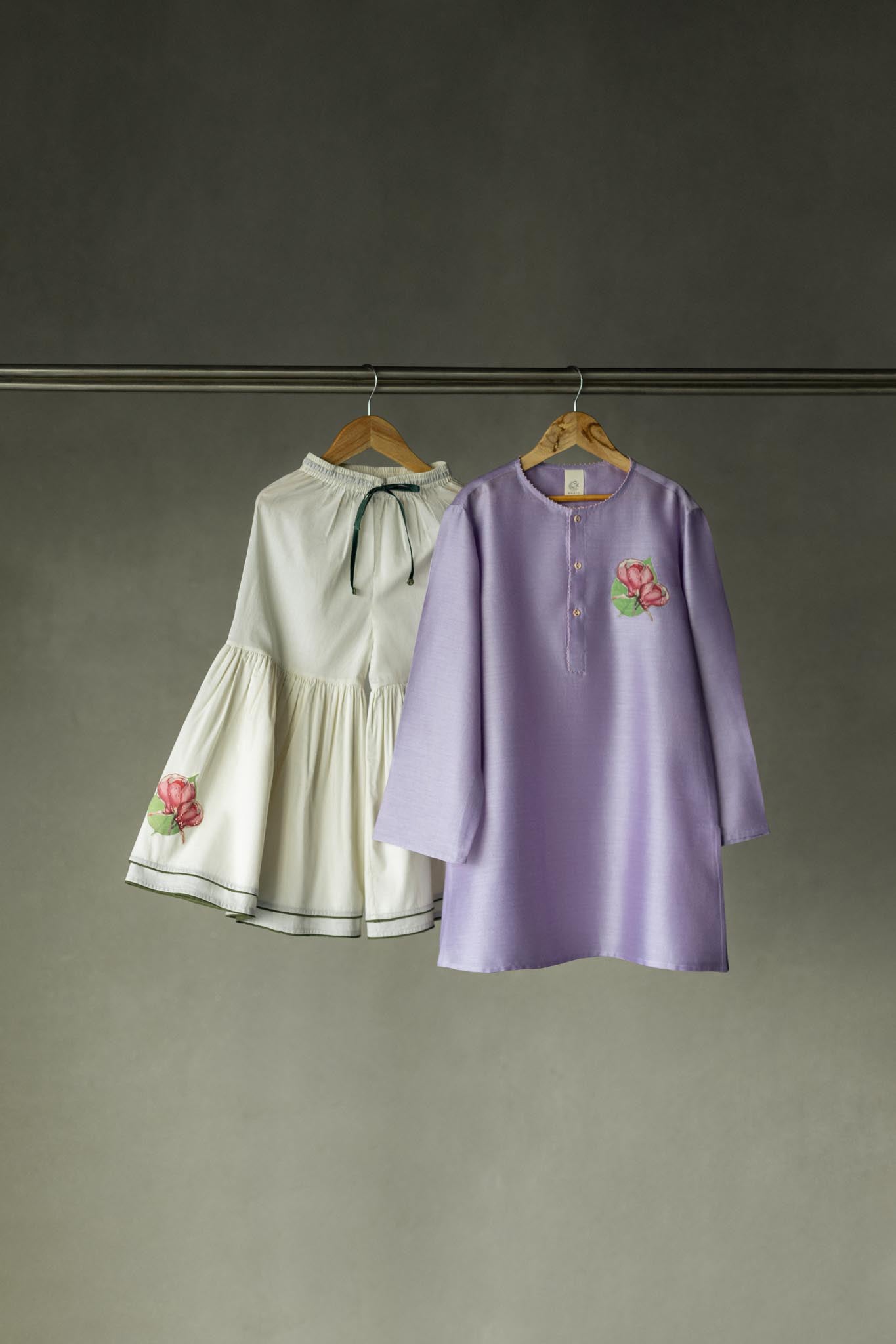Lilac kurta has round neckline with blush bead detailings and hand-applique embroidery brooch, is paired with a hand appliquéd ivory cotton sharara set.