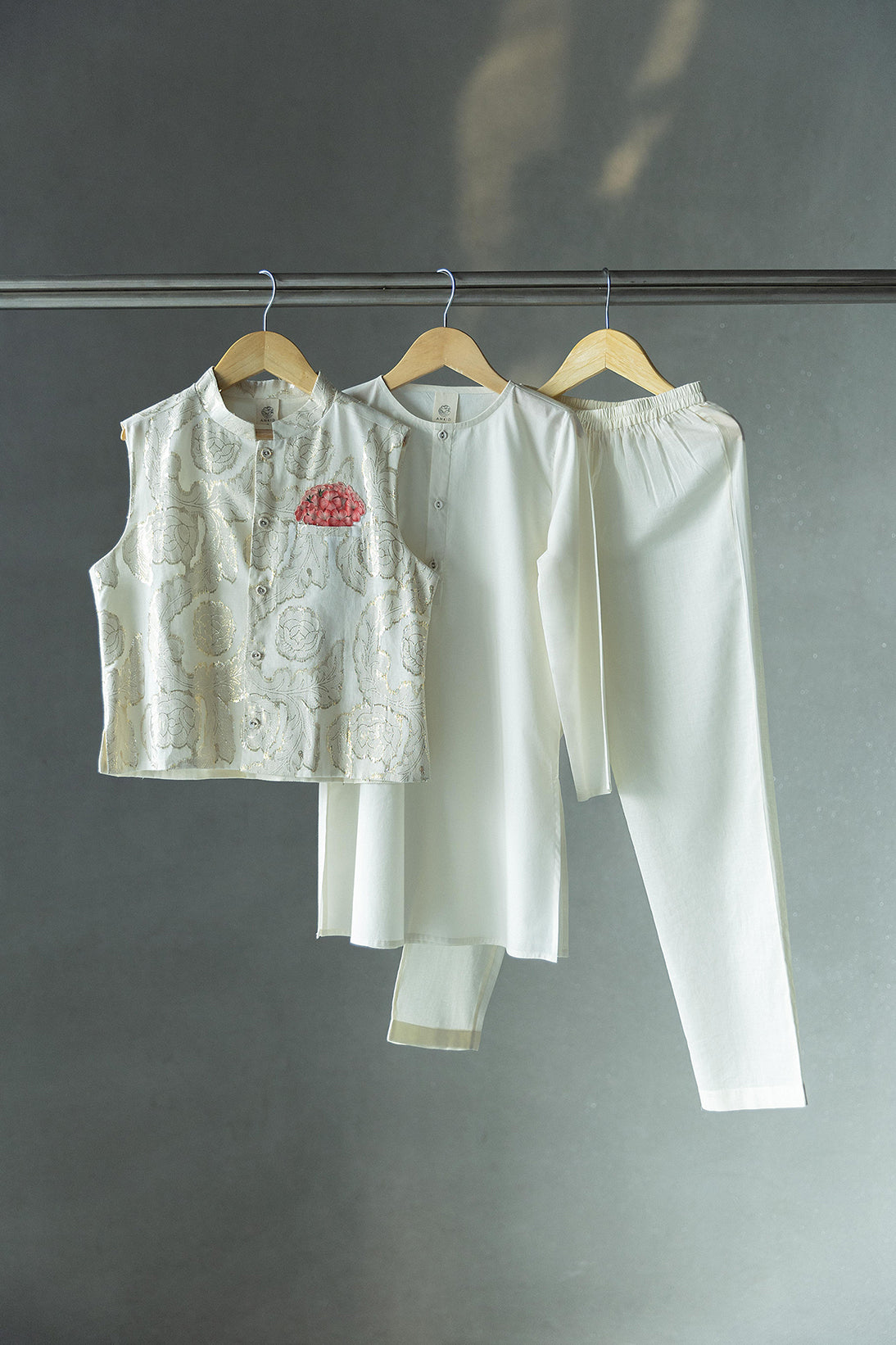 The exquisite jacquard floral detailing is beautifully showcased in the Madhumalti Ivory Bandi,complemented by a hand-done appliqué brooch. It is paired with an ivory kurta and pyjama, ensemble elegance and timeless sophistication.