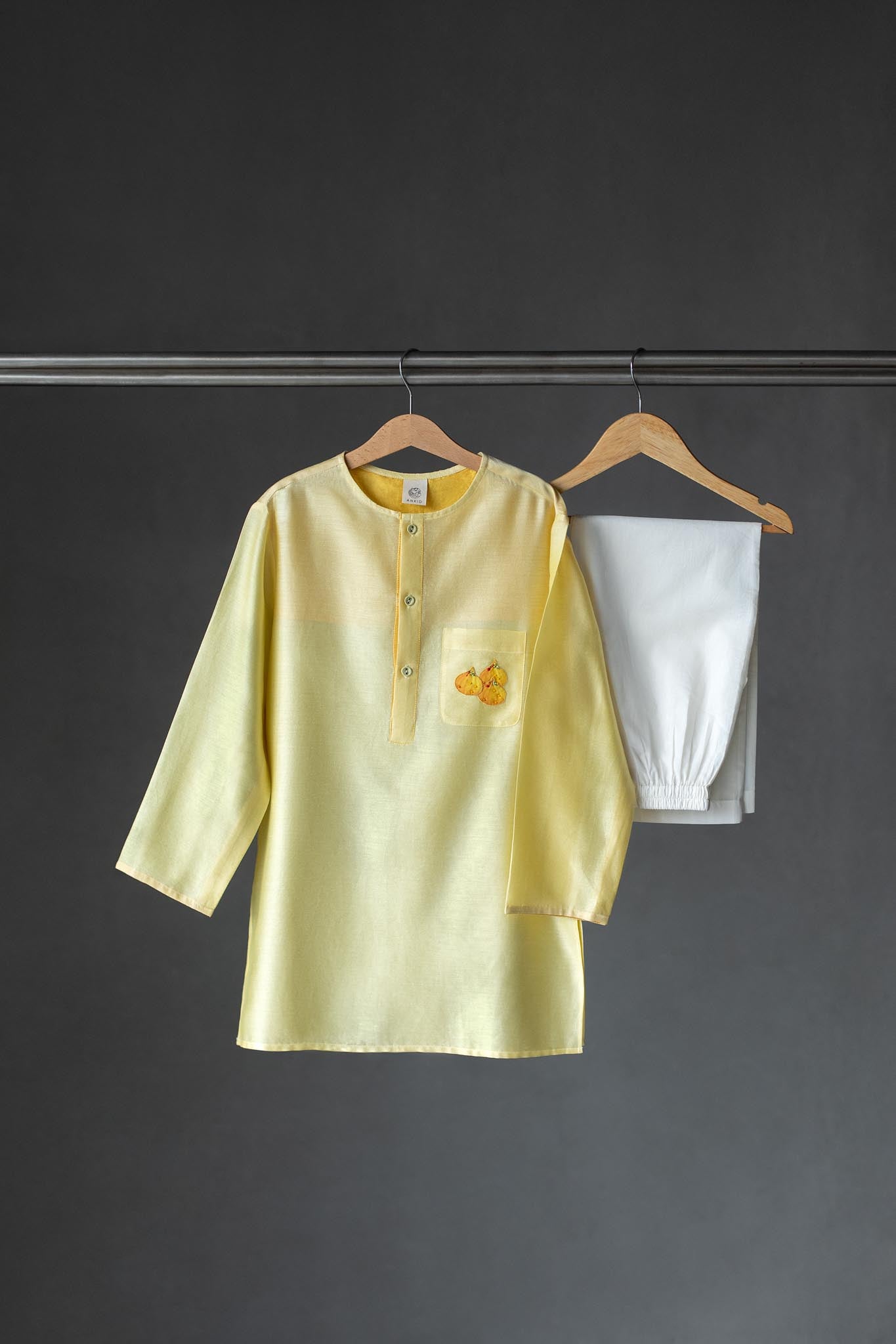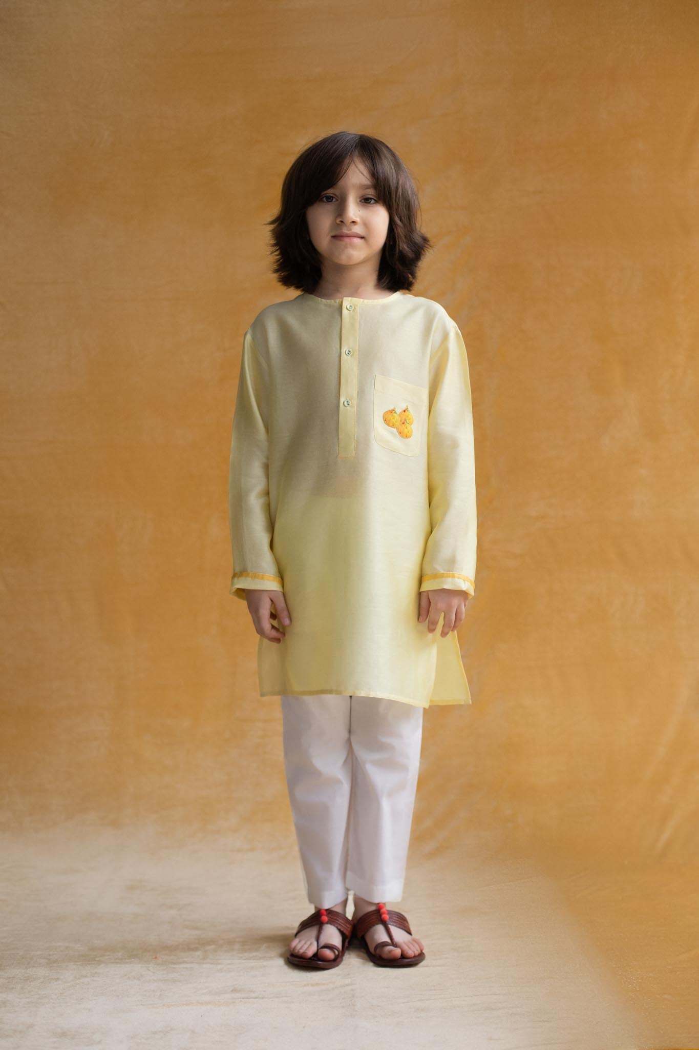 This light yellow kurta is crafted in airy silk chanderi and adorned with hand-appliqué mawa modak motif. The cheerful motif makes this set perfect for Ganpati celebrations, pujas, or simply to keep traditions close to your little one’s heart.