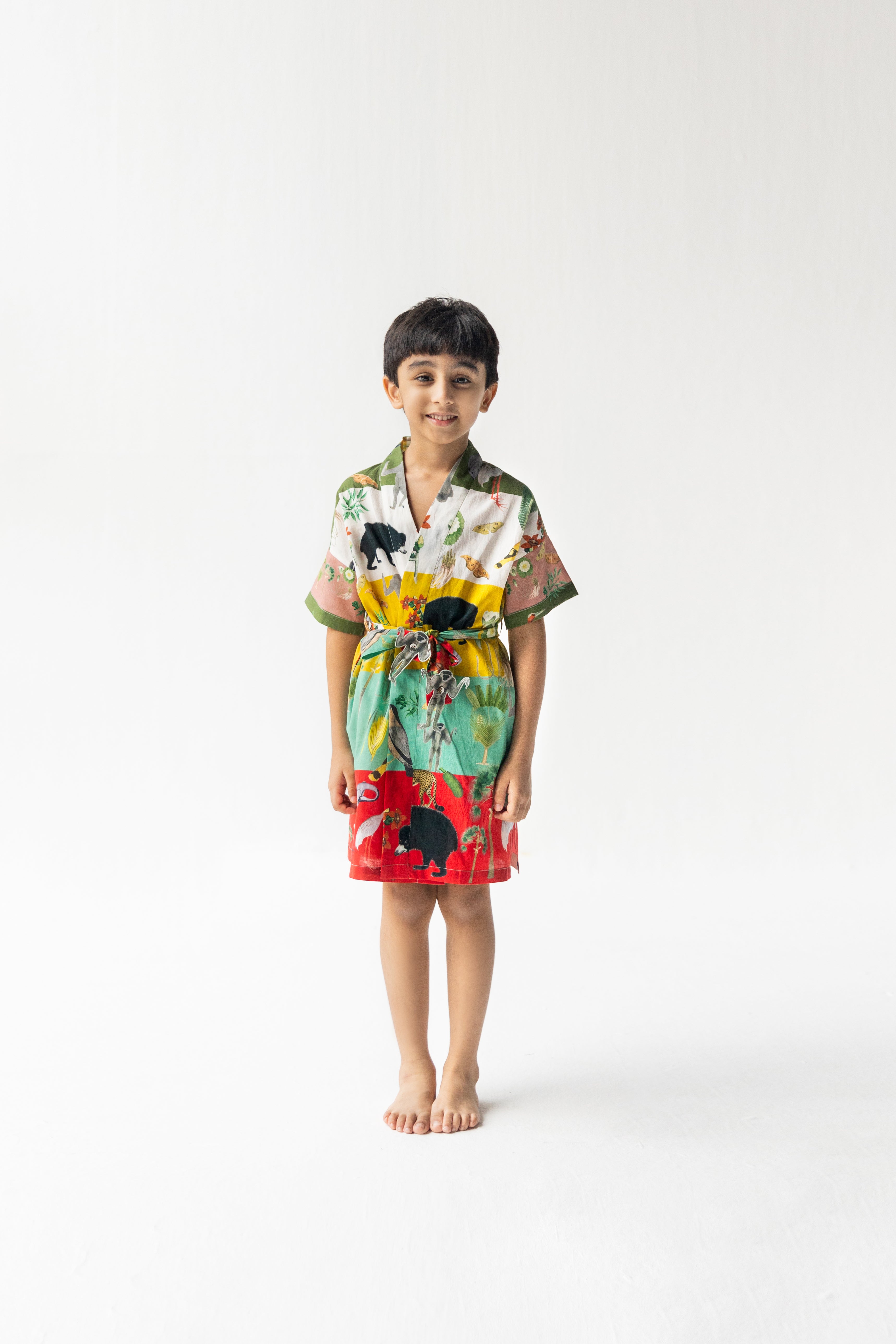 Multi-color chidiya ghar ki sair print half sleeves robe with the front open and it comes with a belt has two brooches attached with buttons.