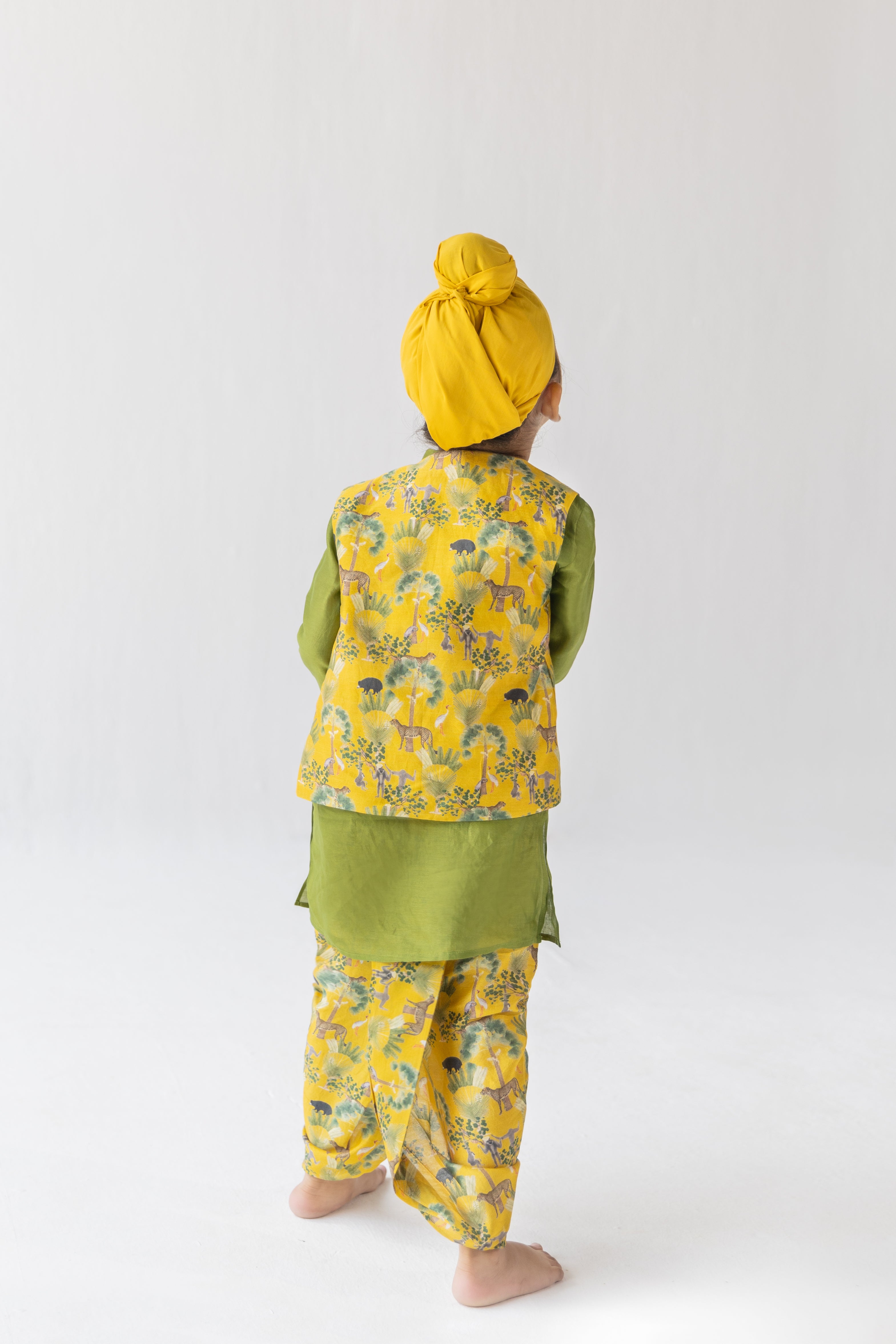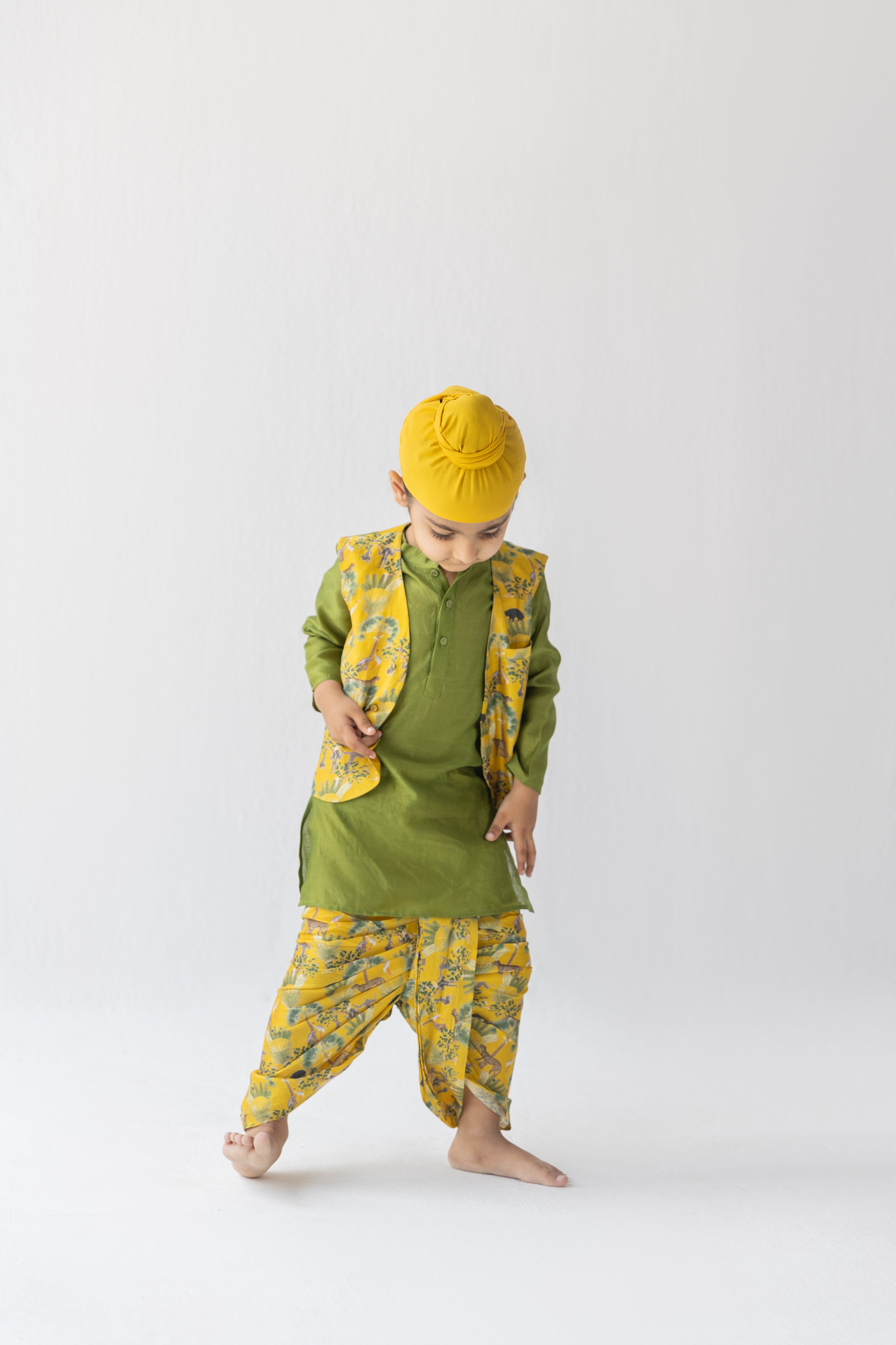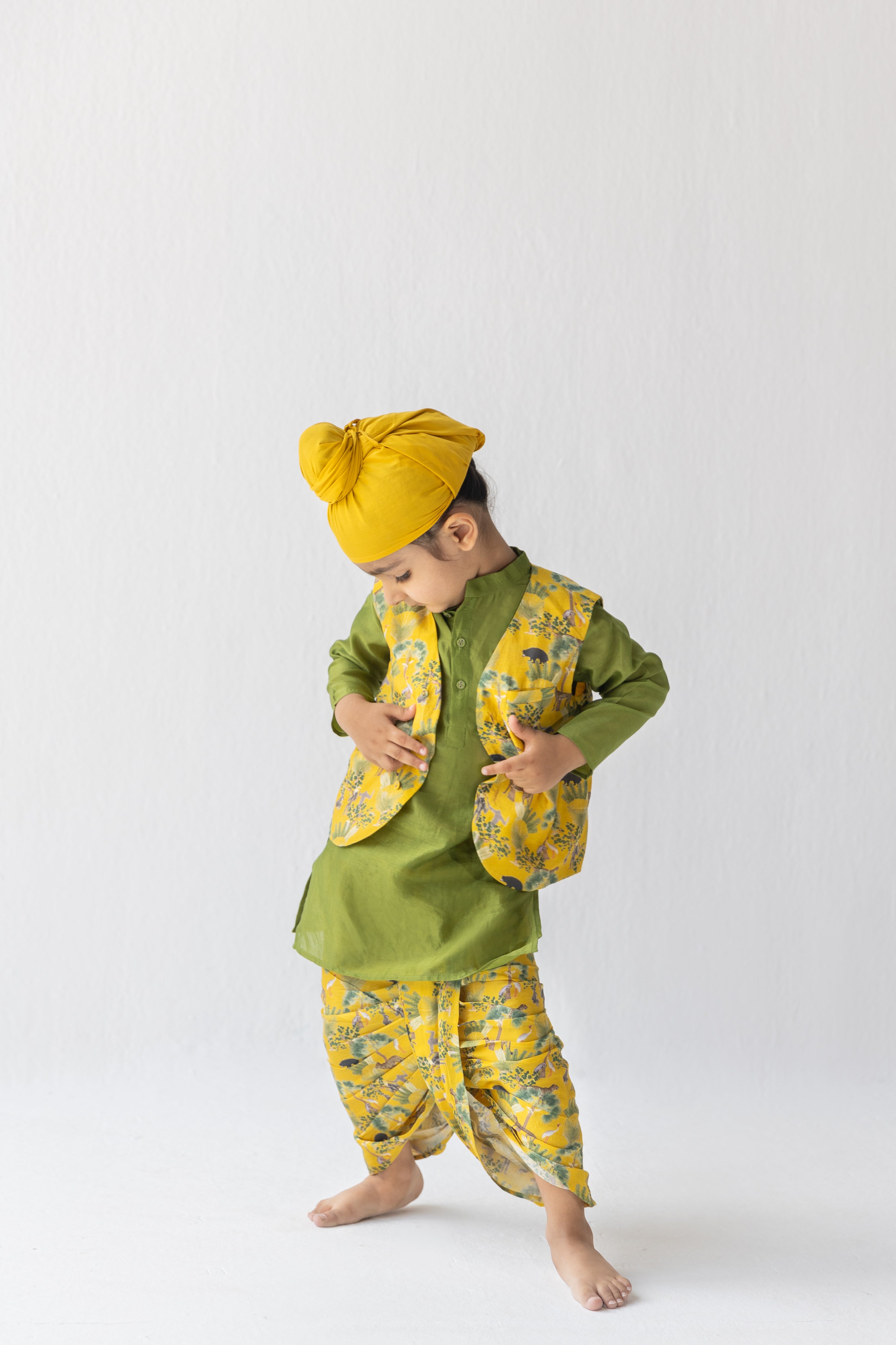The mustard sunderban bandi has a front pocket and the dhoti with elastic waist paired with our olive kurta has side slits opening and full sleeves.
