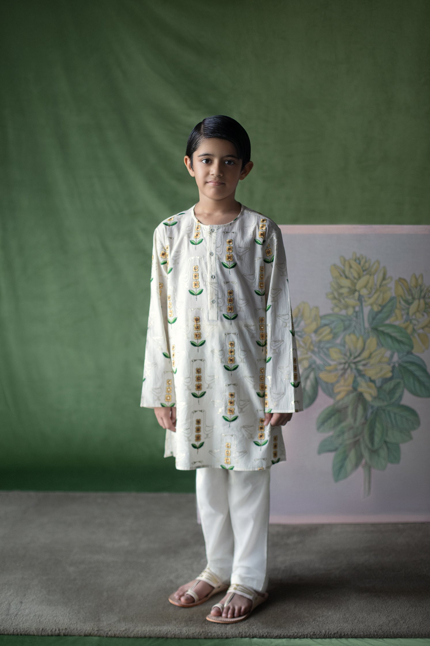 The fresh ivory Pitonia kurta features a round neckline with motif embroidery, depicting two swans gracefully intertwined with delicate pitonia flowers, symbolising love and unity and is paired with a voile pyjama. The kurta is lined with 100% cotton fabric for extra comfort.