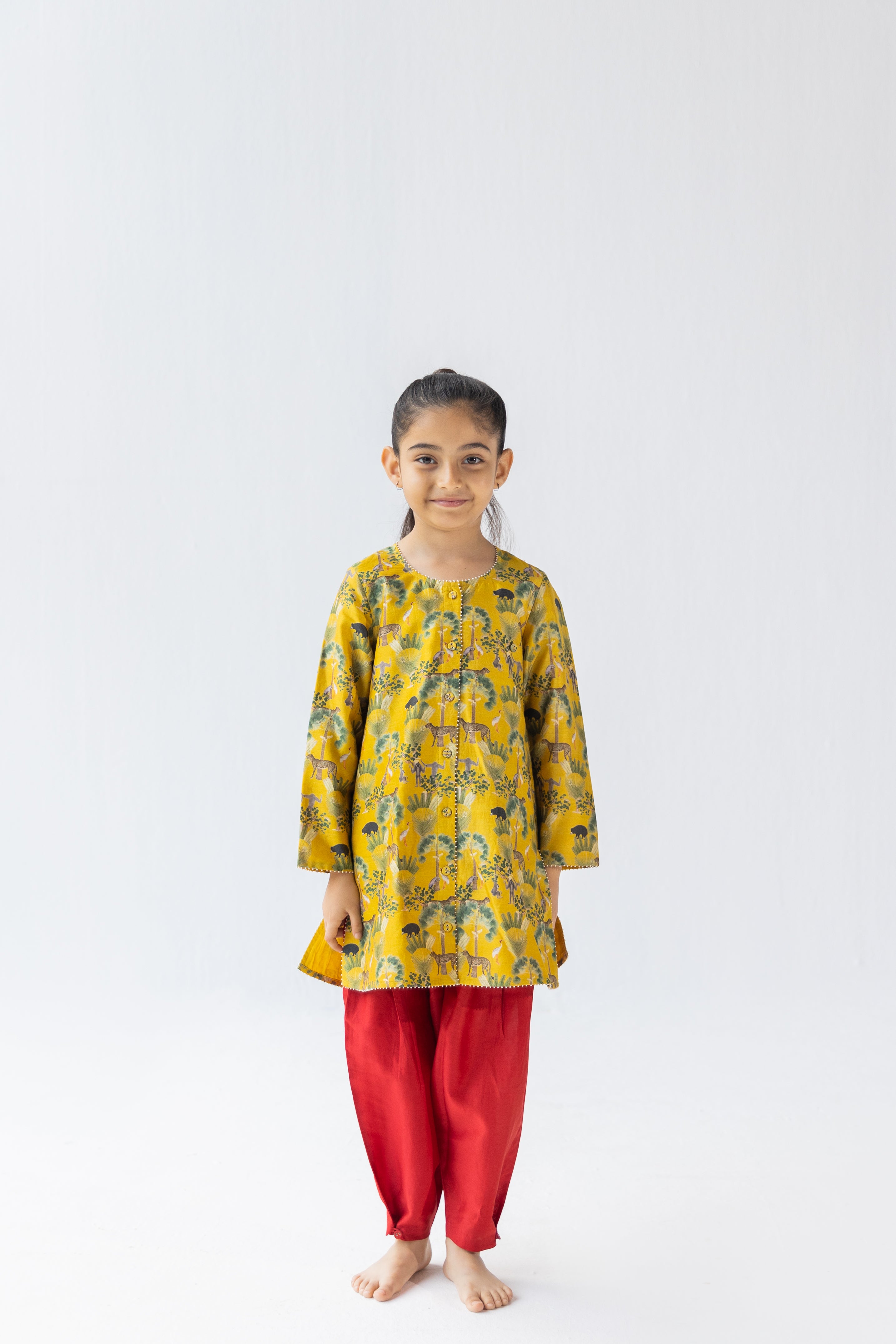 Mustard sunderban print full sleeves kameez with beads embroidered neckline is paired with a red voile salwar has buttons detail at the bottom.