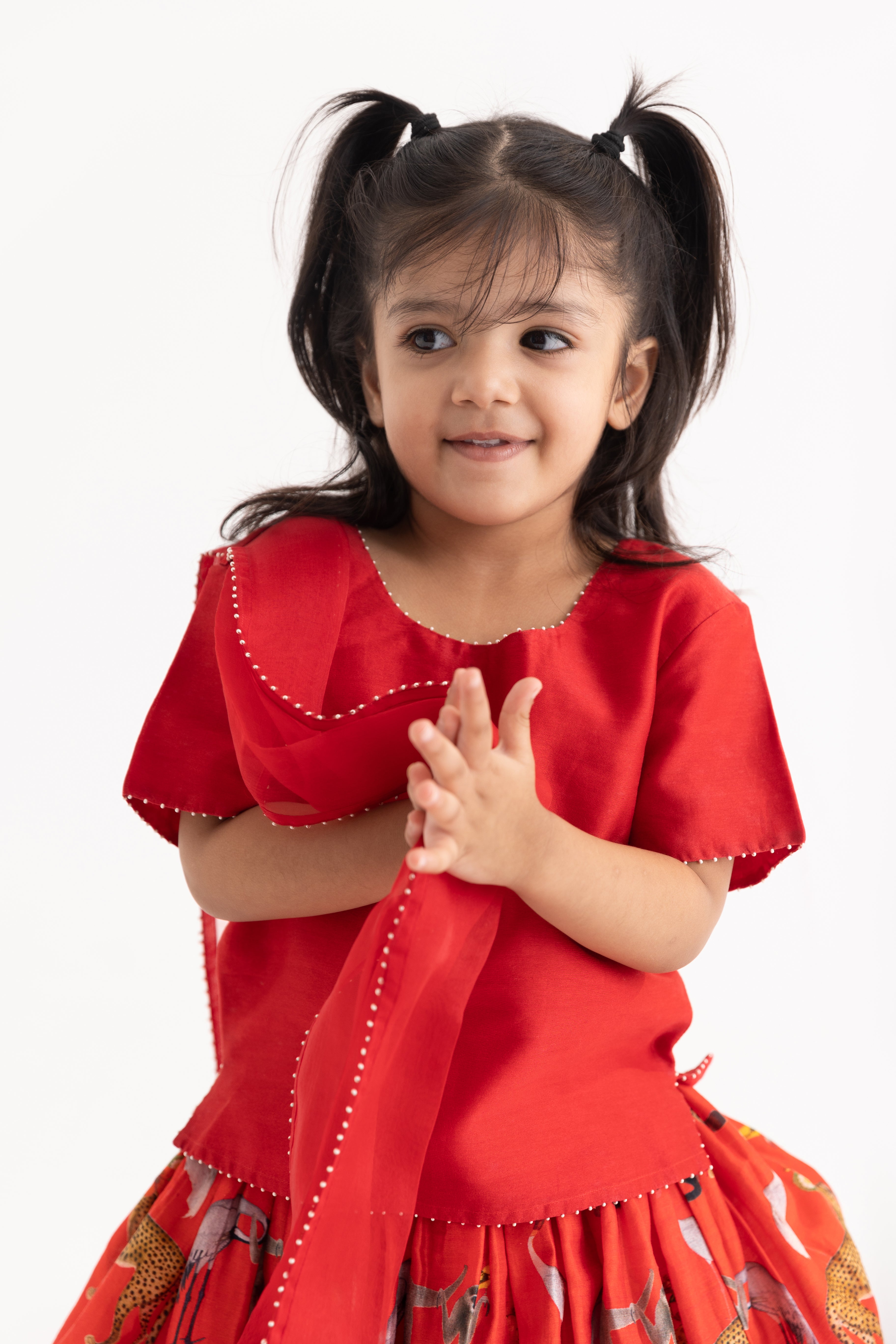 Red chidiya ghar ki sair print half sleeves choli with beads embroidered neckline is paired with lehenga and it comes with an organza dupatta.