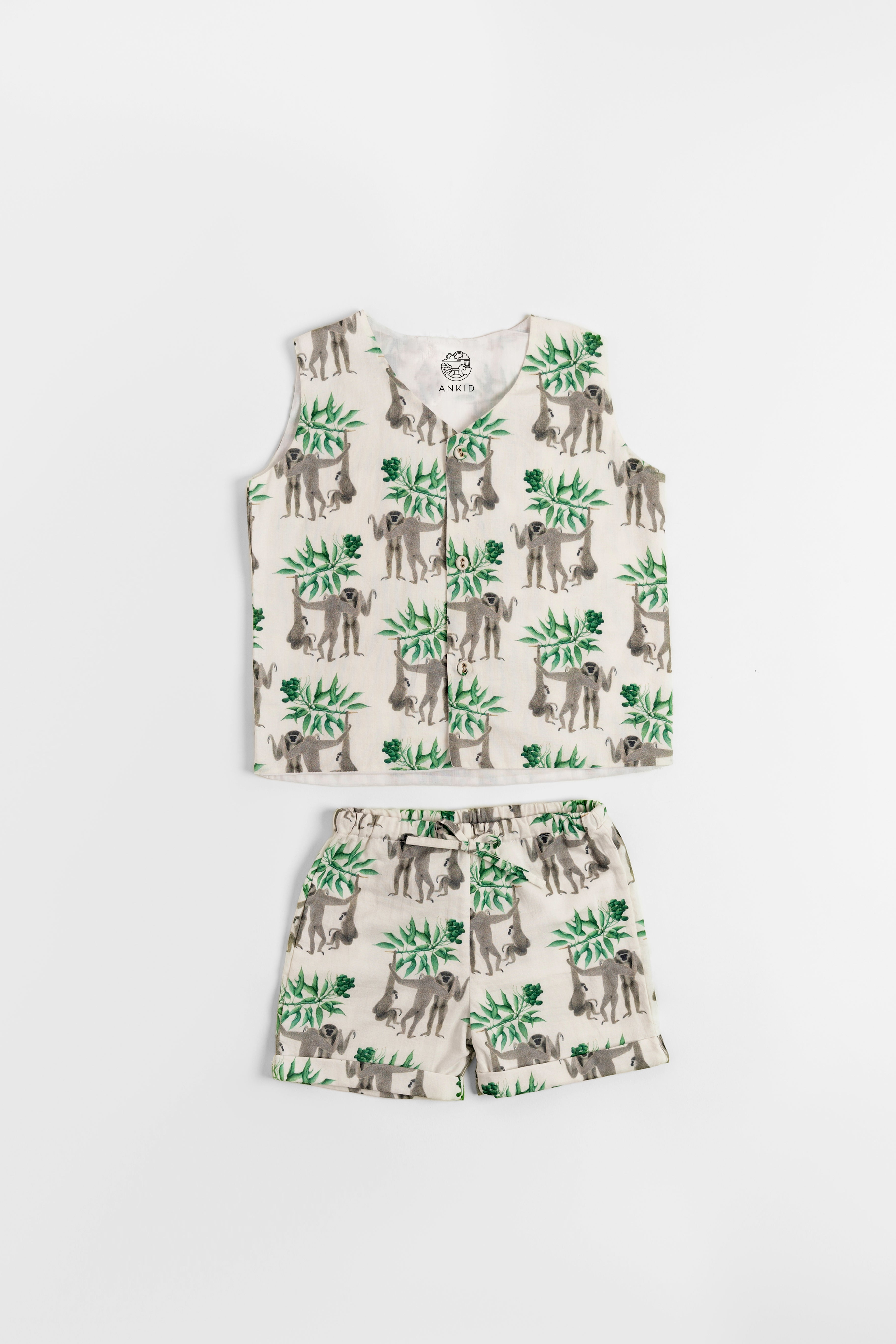 Ivory shararti bandar print vest has front opening and is very comfortable and breathable silhouette, is paired with shorts.