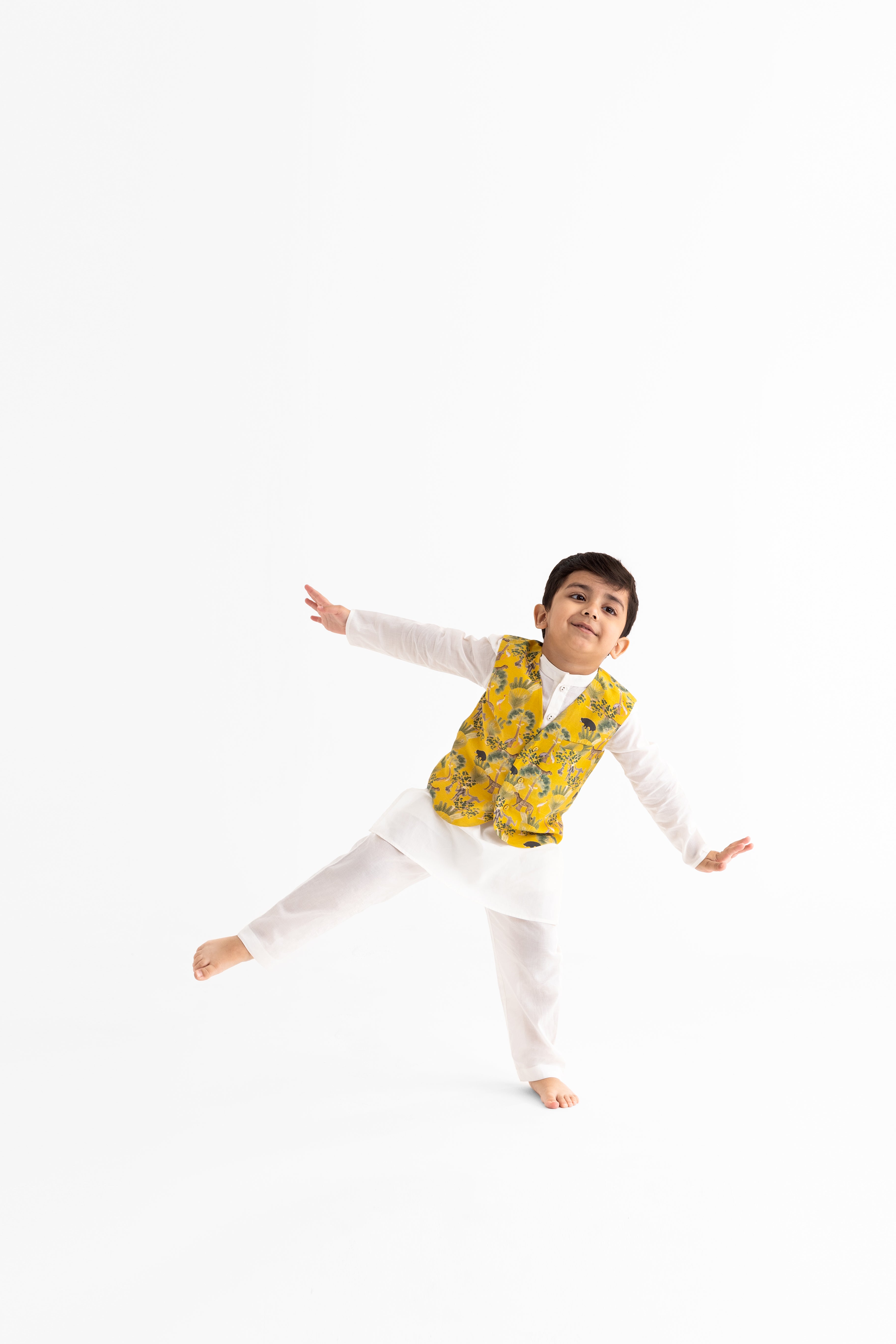 Mustard sunderban print bandi with a brooch placement and is paired with ivory solid kurta and pyjama.