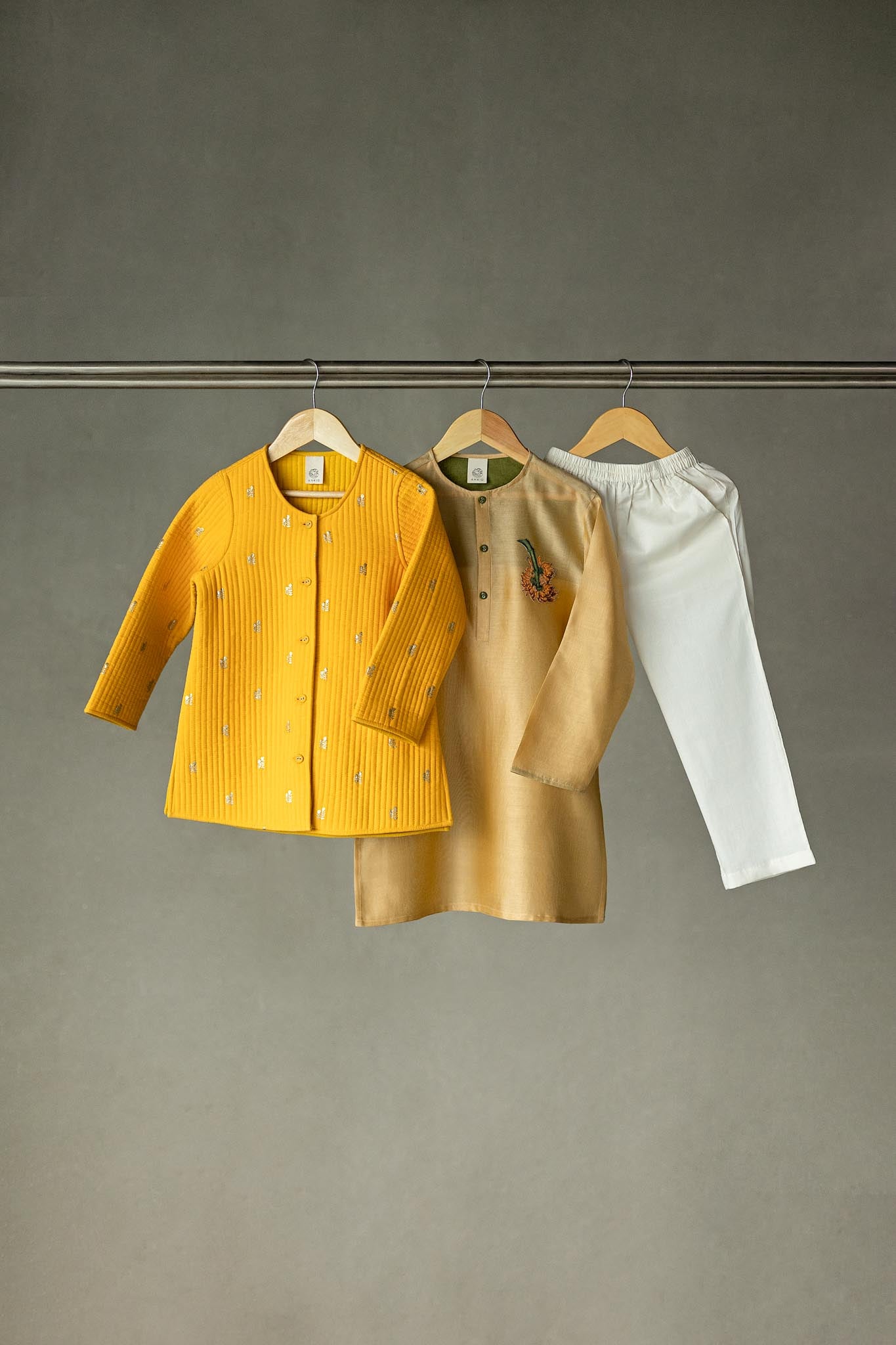 -Made to keep your child warm, Yellow color hand embroidered long jacket, full sleeves, Gender neutral. The set includes yellow quilted long jacket, solid beige kurta & ivory pyjama.