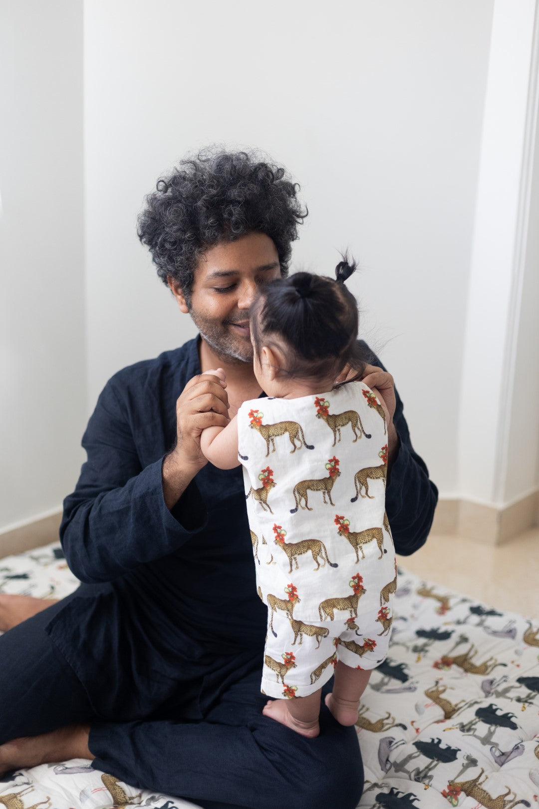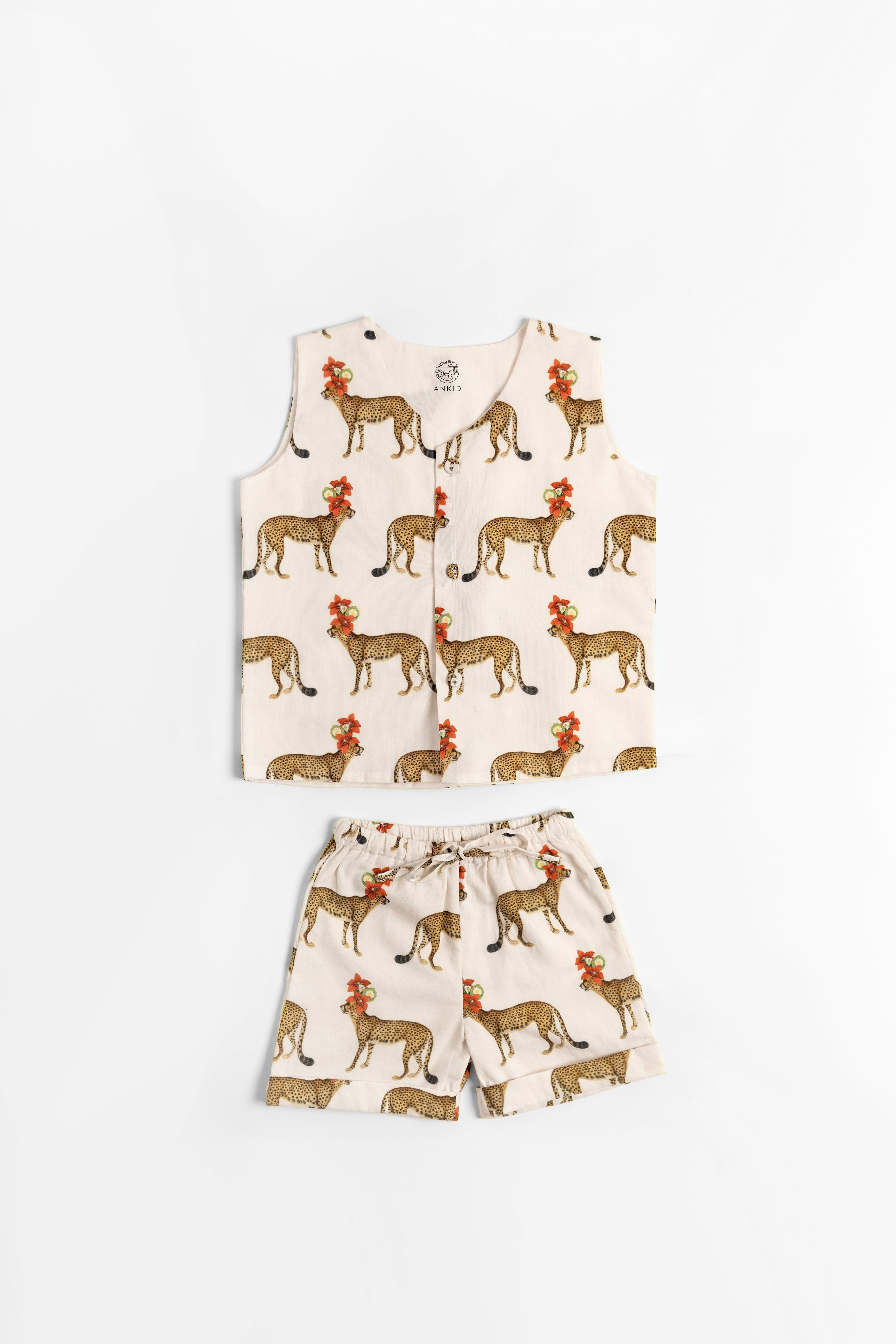 Ivory tendua rajkumar print vest has front opening and is very comfortable and breathable silhouette, is paired with shorts.