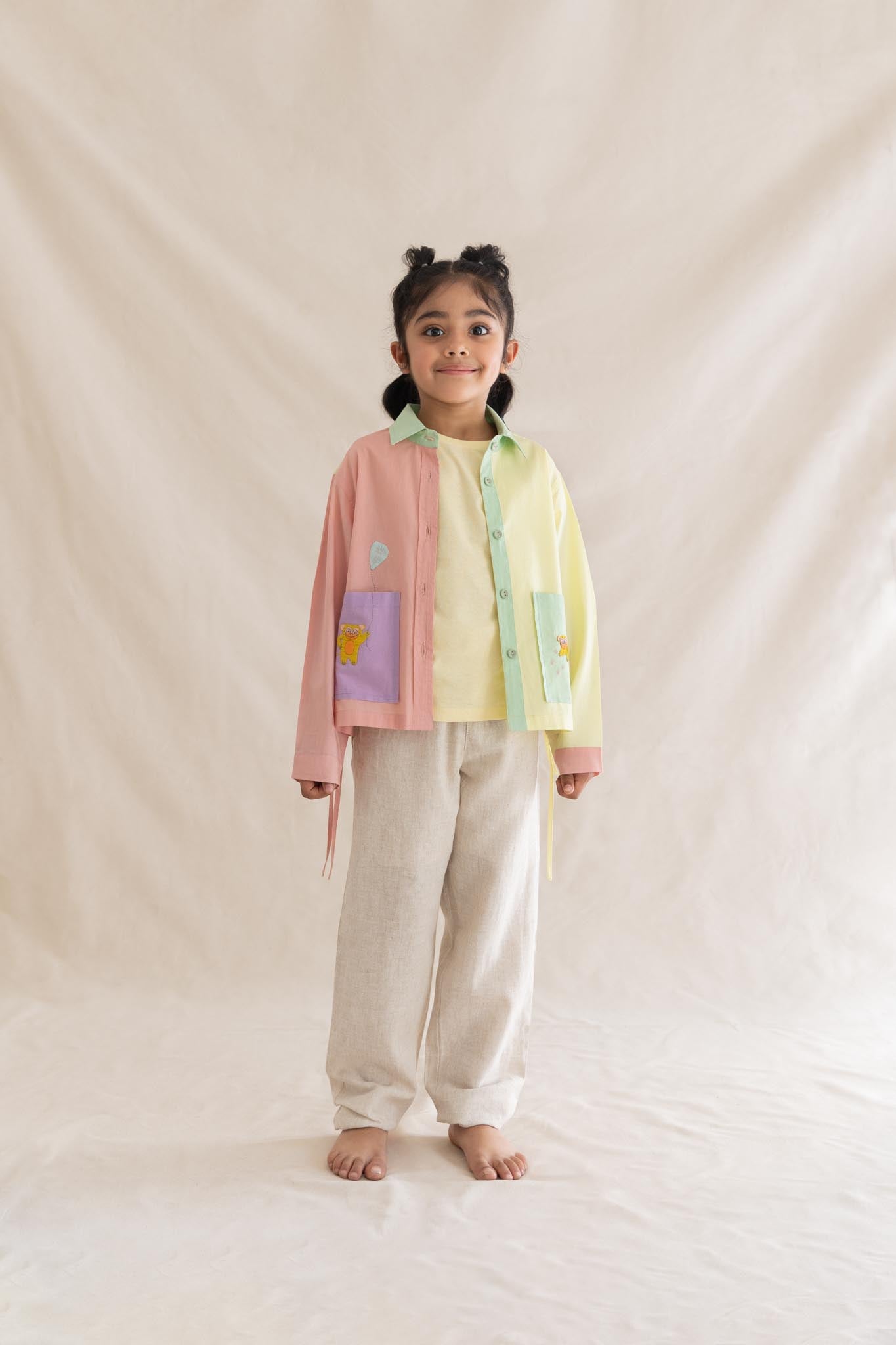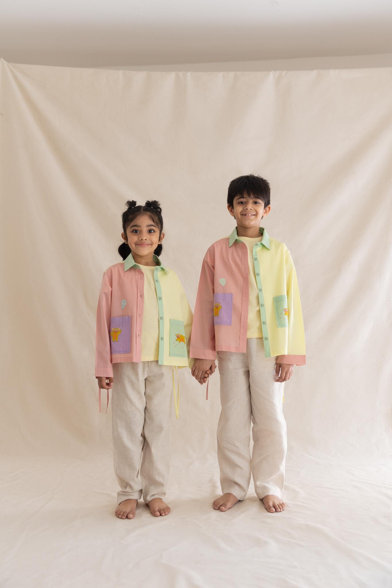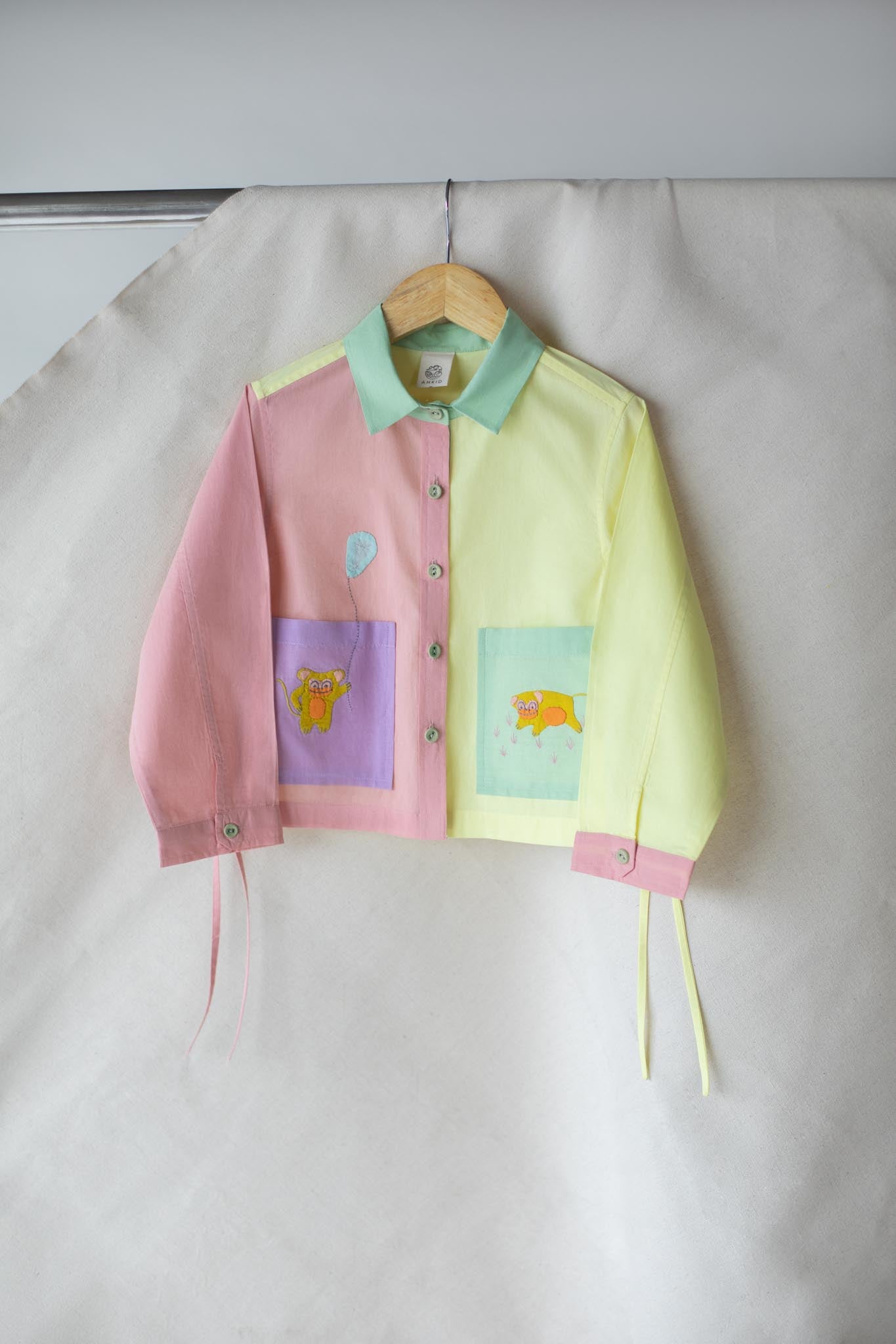 Full sleeve multi color shacket with a contrast classic collar. Hand embroidered applique on the front patch pockets with a button-up front.