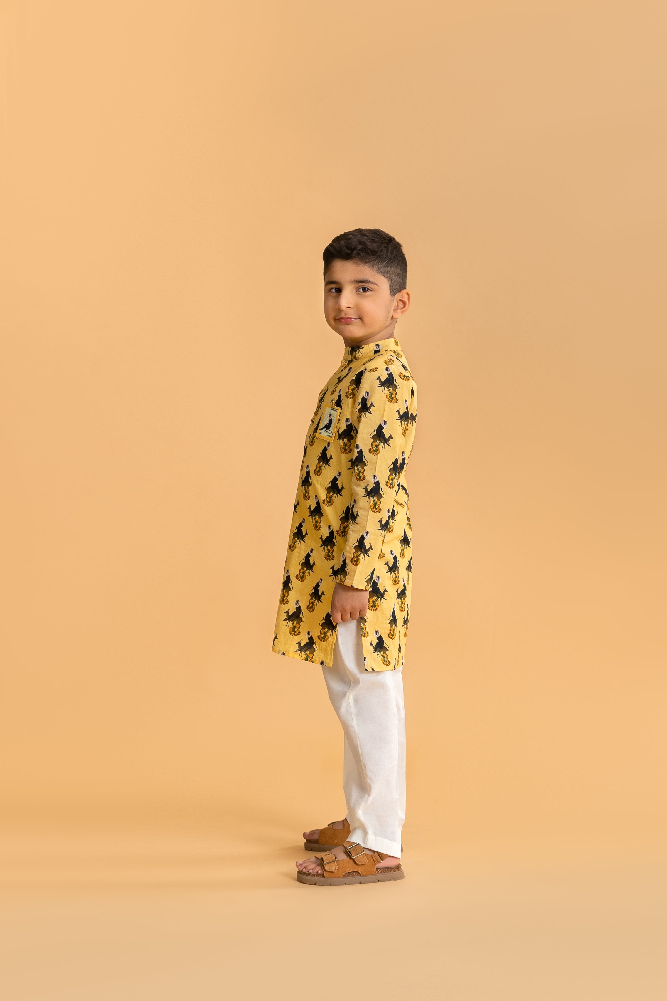 Yellow Kela Chor Langur print full sleeves kurta with mandarin collar and a postal stamp brooch placement is paired with an ivory voile pyjama with has full elasticated waist and side pockets.