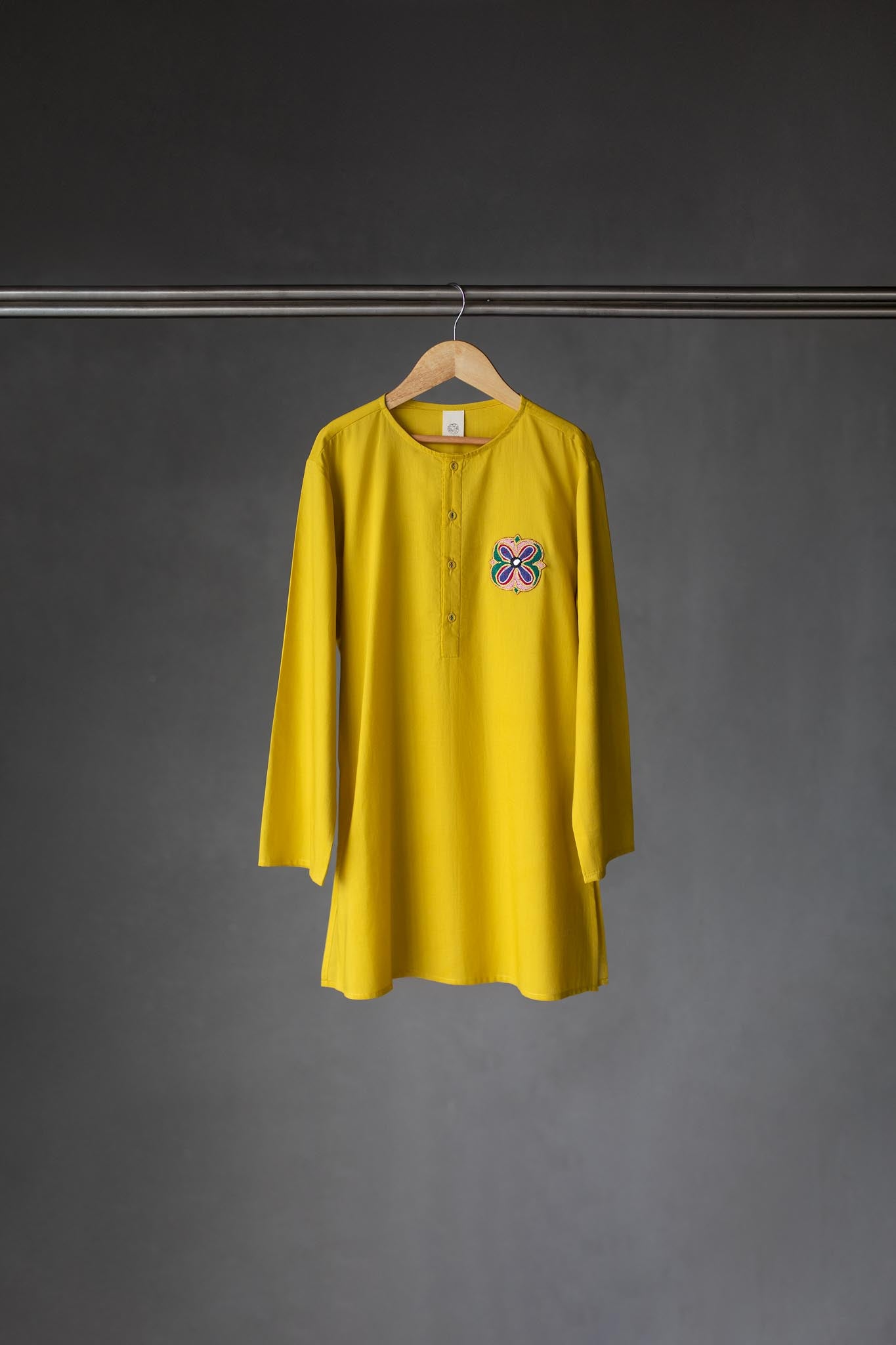 Crafted in 100% breathable cotton. The yellow Ulhas Kurta is accentuated by a Kutchi embroidered motif, hand appliquéd to create a vibrant focal point. Relaxed fit, buttoned neckline.